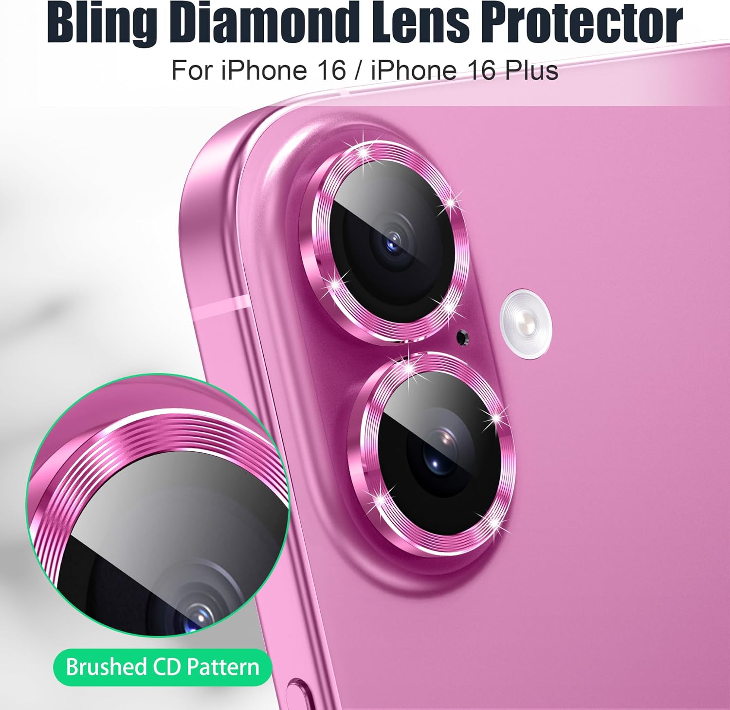 AGVEE 3+3 6 Pack for iPhone 16 6.1" / 16 Plus 6.7" Camera Lens Cover Protector, Bling Glitter & CD-Textured Metal Ring 9H Tempered HD Glass Camera Cover Protector Film, Glitter-Rose