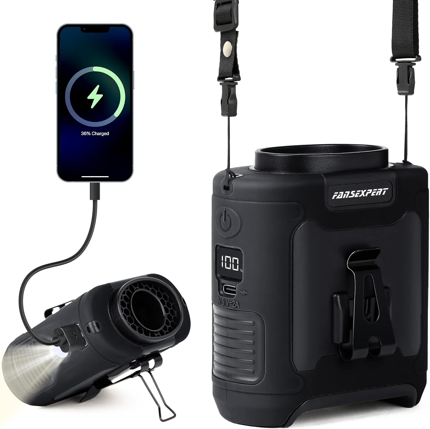 - 【Long Battery Life】With a built-in 10,000mAh rechargeable battery, this portable waist fan can run for up to 40 hours on low speed and takes 4-5 hours to fully charge. It supports usage while charging and features a 5V-3A Type-C input and a 5V-2A USB output, making it ideal for outdoor activities.