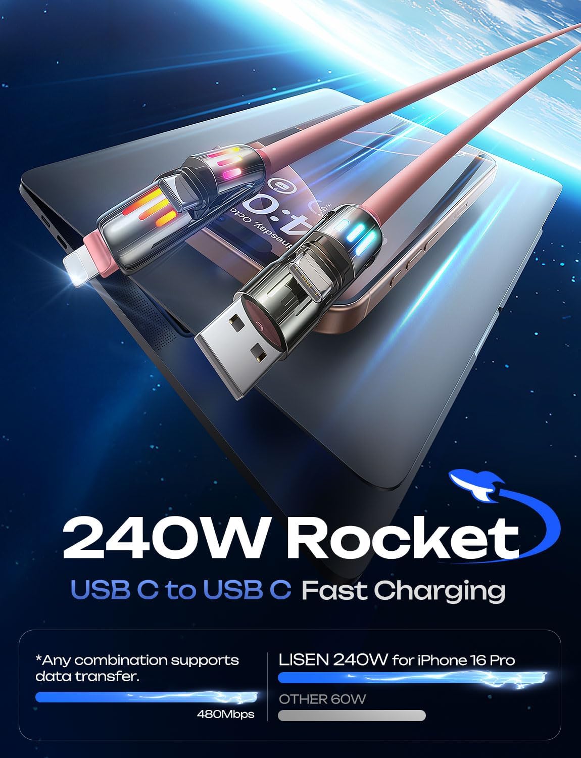 - [What You Get] LISEN pink iphone charger cable 6.6FT, a length suitable for any situation, so you no longer need to stay near a power outlet. Additionally, our reliable customer service is available 24/7—if you have any questions or issues, feel free to contact us. We guarantee resolution within 24 hours. Please note, the 240W Type-C cable can power laptops through the Thunderbolt port, but it is not a USB 3.0/4K cable.