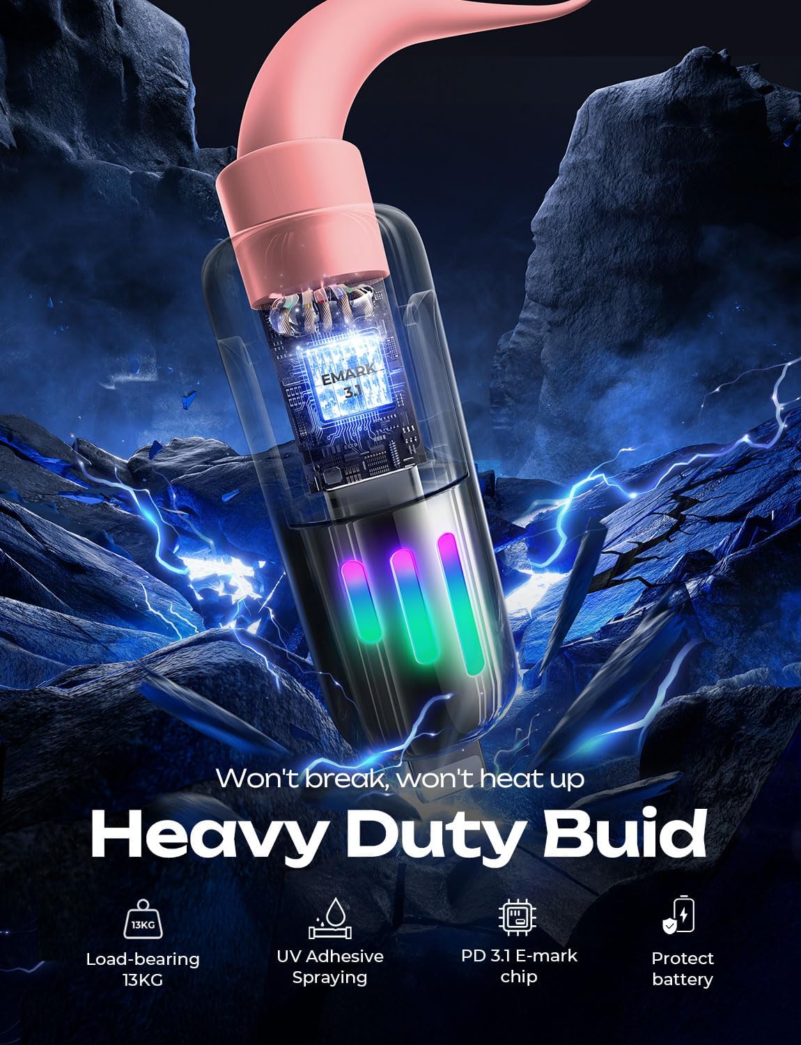 - [PD3.1 Emark Safe Chip & RGB light] The USB C to USB C Cable EMARK3.1 chip not only enables 240W fast charging but also maximizes device safety, ensuring 24-hour constant temperature charging. It automatically stops charging once the device is fully charged, preventing overcharging and battery damage. And RGB lights on both ports will keep changing colours when charging. It is a soft light, not flashing eyes, full of gaming atmosphere.