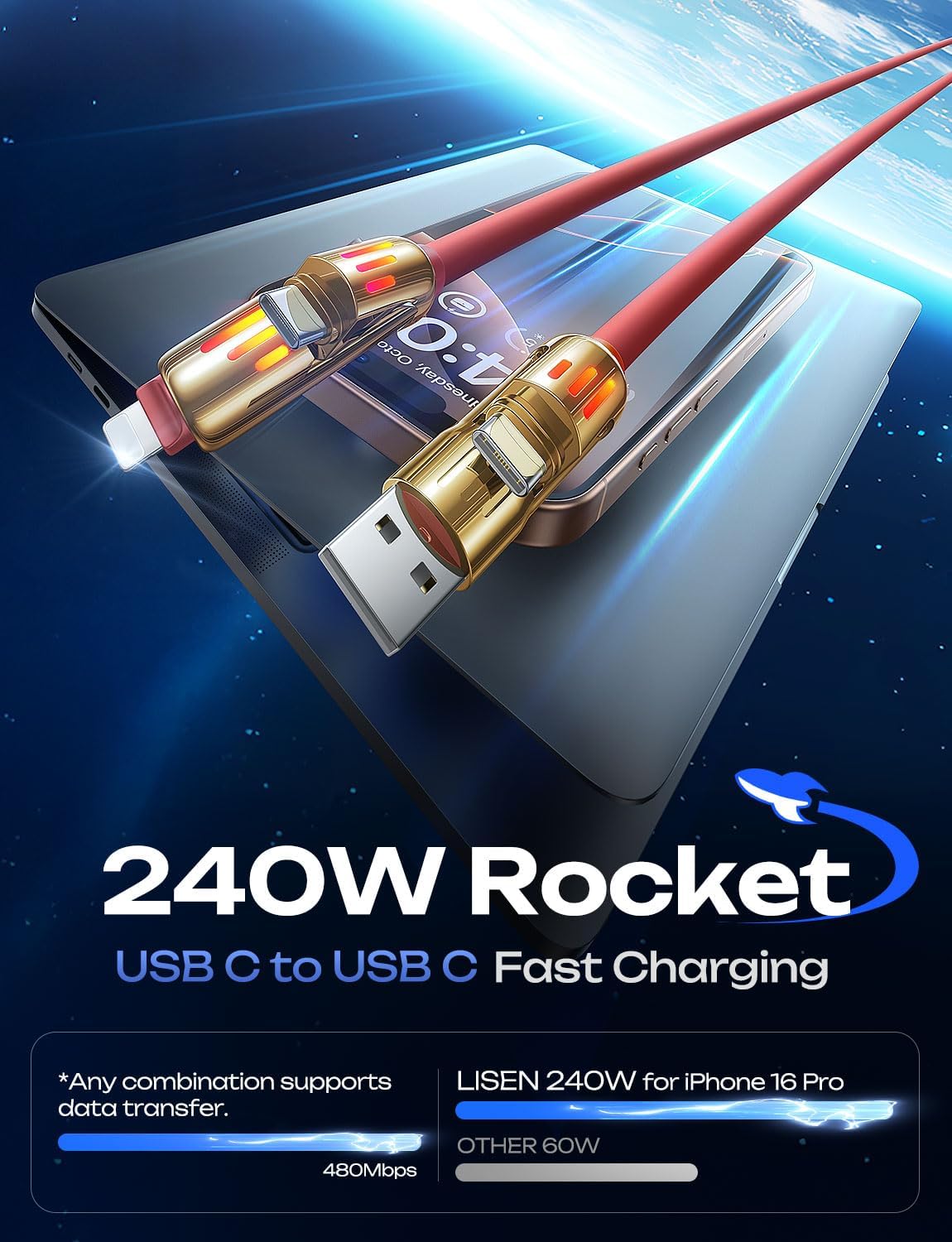 - [What You Get] LISEN 6.6FT 240W 4-in-1 Multi Charging Cable, a length suitable for any situation, so you no longer need to stay near a power outlet. Additionally, our reliable customer service is available 24/7—if you have any questions or issues, feel free to contact us. We guarantee resolution within 24 hours. Please note, the 240W Type-C cable can power laptops through the Thunderbolt port, but it is not a USB 3.0/4K cable.
