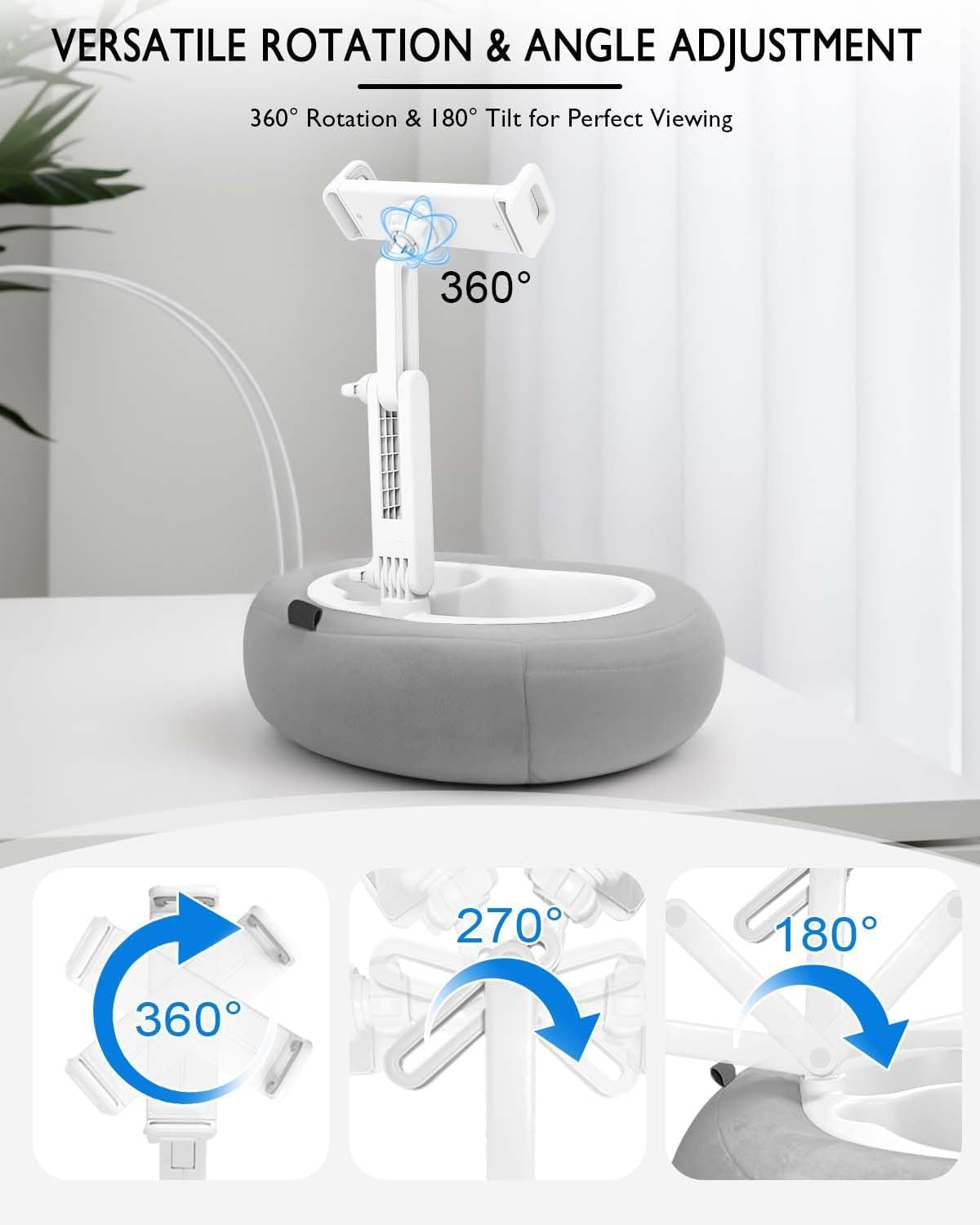 - Adjustable Viewing Angles: The phone stand for bed with a 360° rotating clamp and flexible dual arms that fold 180°, you can effortlessly find the perfect angle whether sitting or lying down, promoting comfort while keeping your neck relaxed and your eyes aligned.