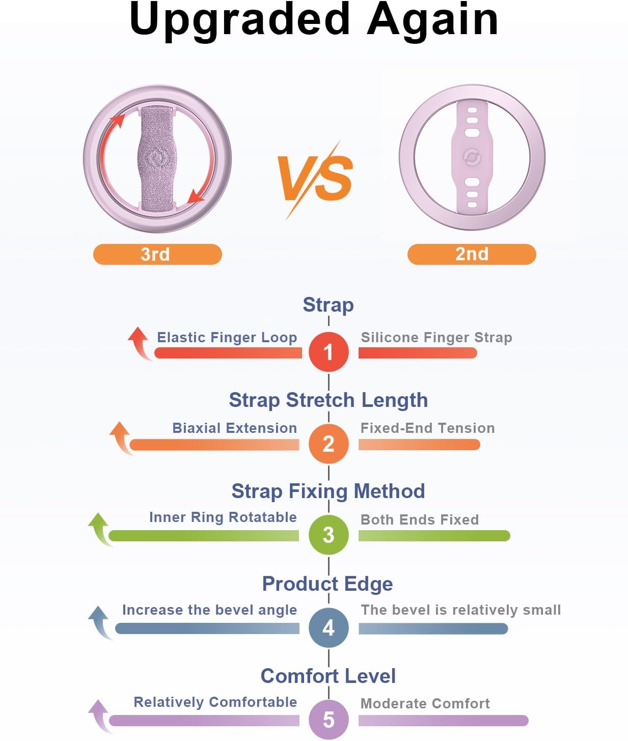 - Comfortable Elastic Phone Grip: This strap features a more comfortable and highly stretchable high-elastic strap, with a looped band that offers double the extension length, greatly reduced the pressure on the fingers when using the strap. The strap is fixed on a rotatable inner ring, allowing you to easily adjust your phone to the most comfortable angle while using the grip.