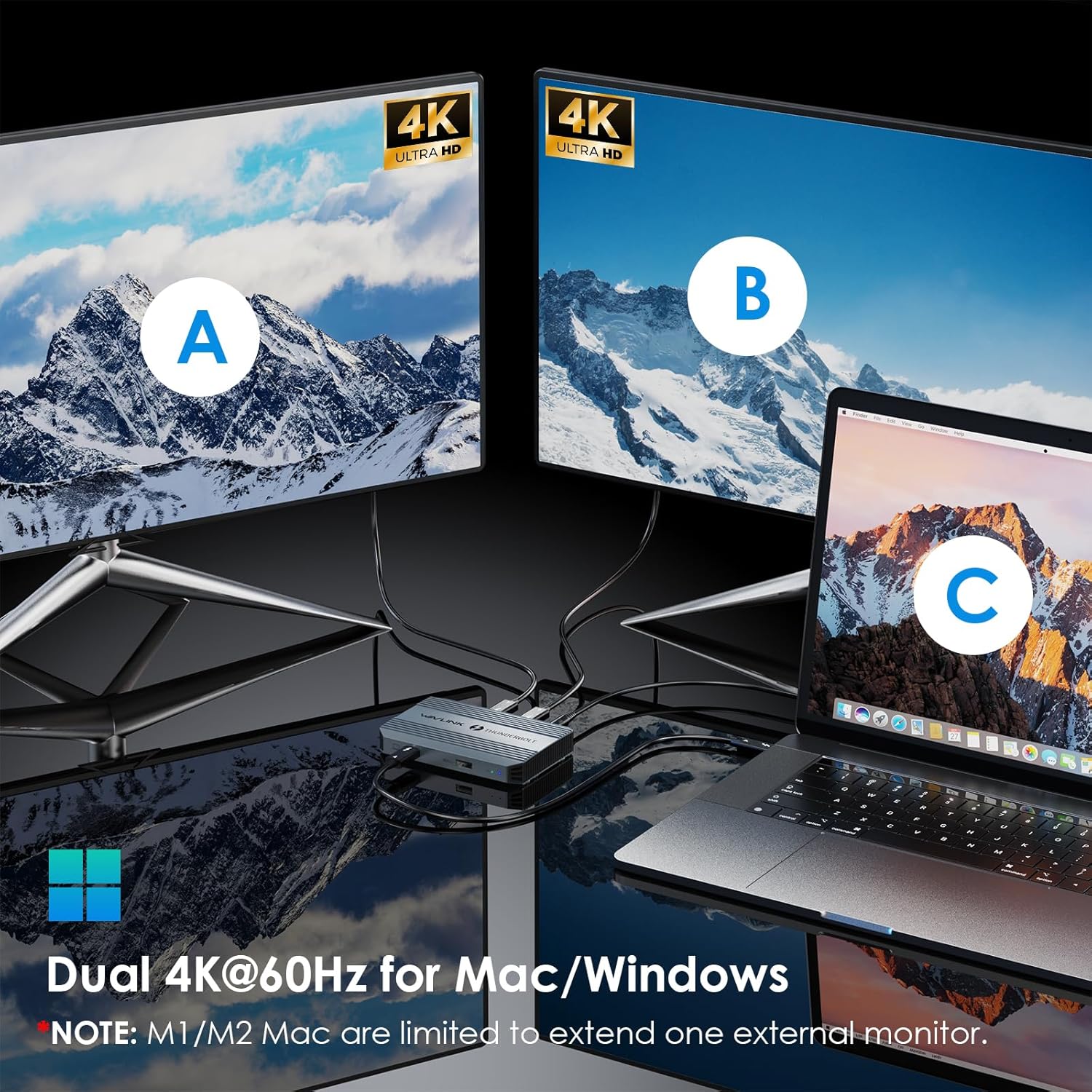 - Note - M1/M2 based Macs do not support dual monitors, you can only extend ONE monitor, the other monitor will not be displayed. For M3 based Mac, pls close the lid of the Mac to make dual external monitors work. You can extend/mirror dual monitors via two of the three downstream Thunderbolt 4 ports only, cannot reach 3 monitors. Please make sure your device's USB-C port supports charging and video output.