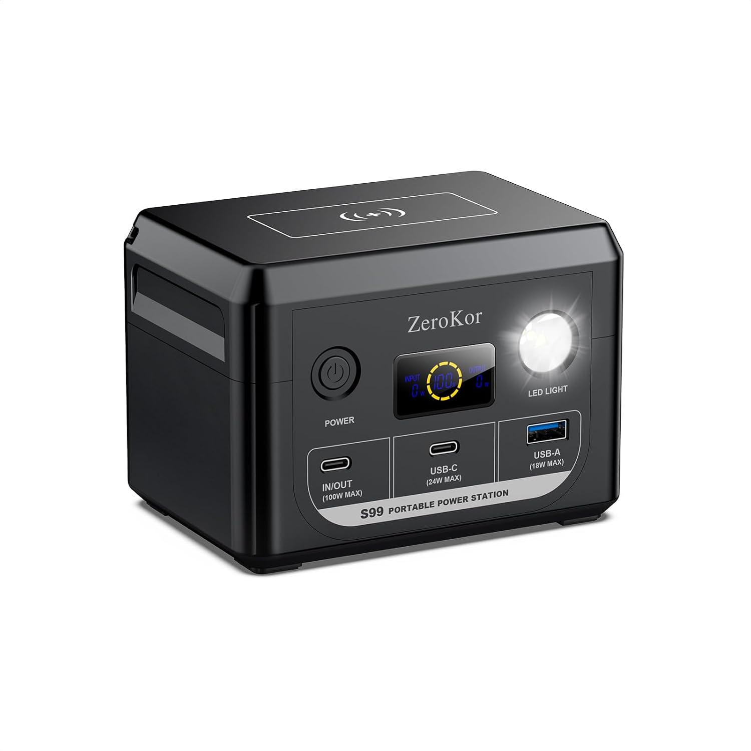 - Multiple Charging Ports: Features multiple charging options to meet your various device needs:1*USB-C1(100W Max);1*USB-C2(24W Max); 1*USB A(18W Max).The portable power station maximum input and output power peaks are 100W each.ZeroKor 100W portable solar generator supports fast charging and allows you to charge multiple devices simultaneously