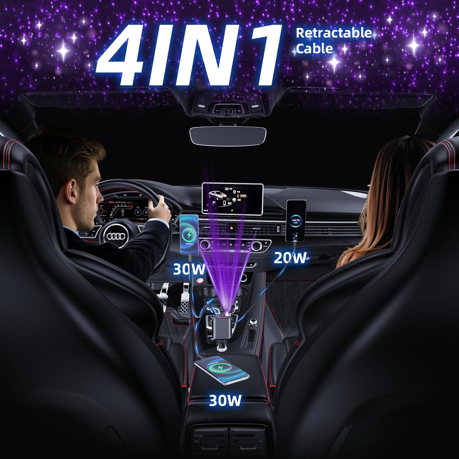 - The 4 in 1 Starlight Retractable Car Charger with Max 120W Type-C Retractable Cable (Fast Charging Port), IOS Converter Connector, Dual USB Ports for USB-C and USB-A, and additional Purple Star Top Ambient and RGB light, the retractable cable extends up to 31.5 inches, making it the perfect men's truck accessory and a cool gift for the A cool gift for truckers, it supports Android and iPhone users, includes fast USB C charging for the iPhone 16 Pro Max and other USB C devices, and provides a simple storage solution to keep your vehicle neat and organized