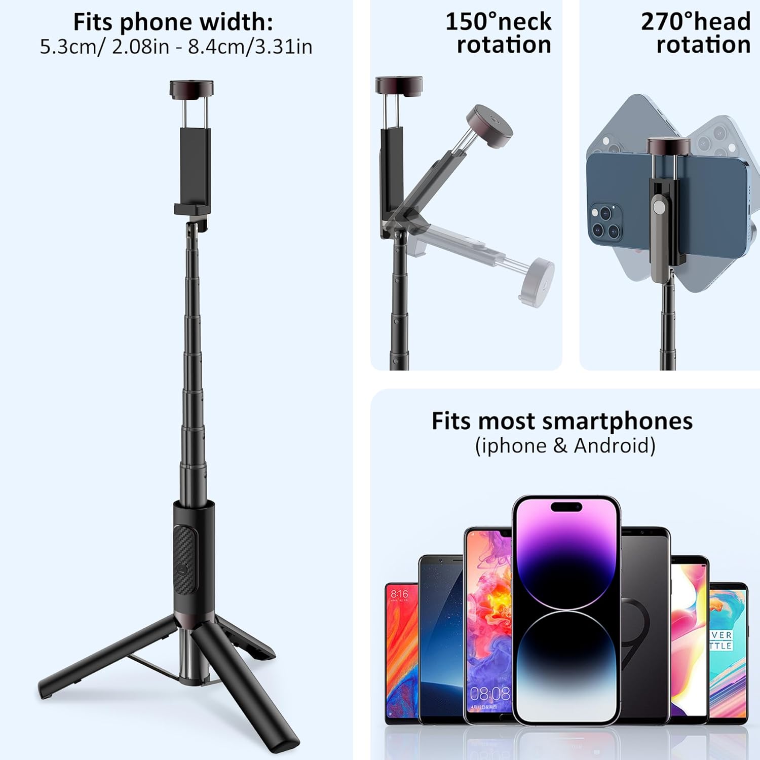 - ROTATABLE SELFIE STICK TRIPOD - 220° adjustable rotation bracket + 270° swivel phone holder for flawless angles.Max 33 in extendable aluminum alloy stick (lightweight yet sturdy), Steady tripod base for shake-free videos and time-lapses.The cell phone holder can support phones with a width of 2.16in-3.42in (screen size of 4-7 inches), compatible with almost all cell phones. Built-in anti-slip pads to protect your phone from falling.