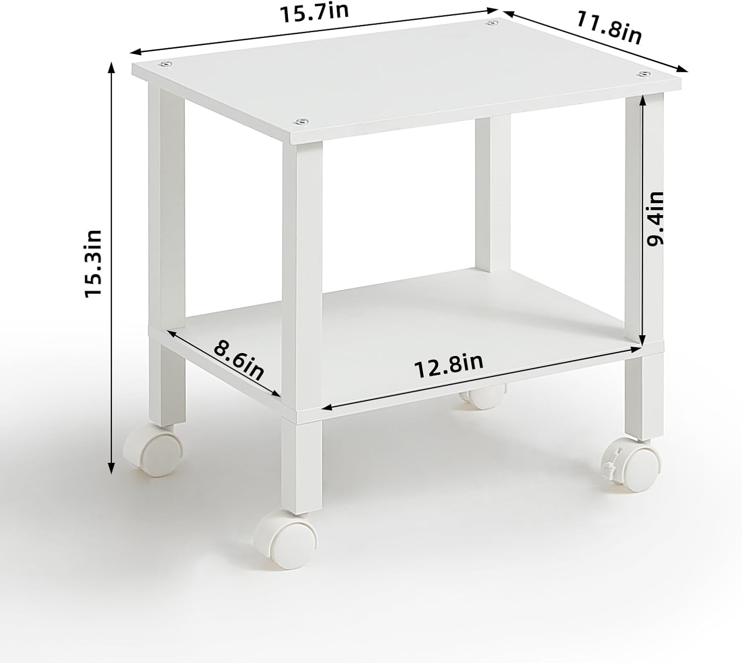 2 Tier Printer Stand with Storage,Under Desk Shelf Printer Table, Rolling Printer Cart for Office,Home,White