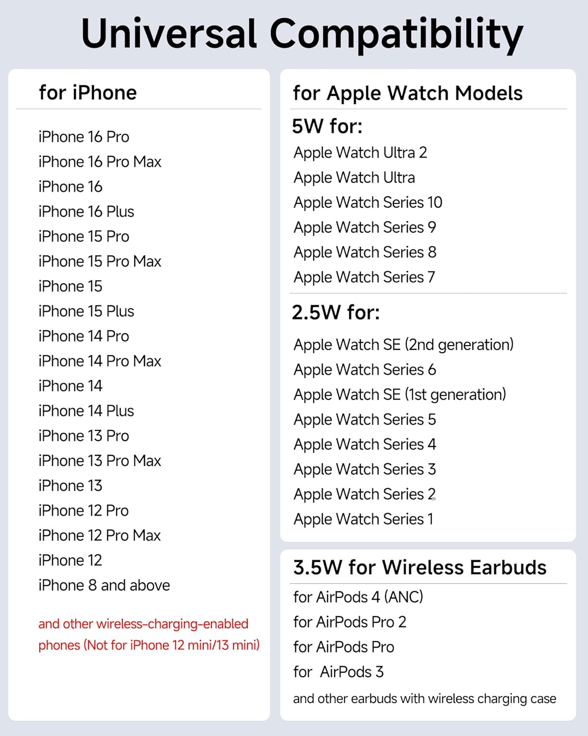 - Compatible Phone Models : Compatible with iPhone 16 Pro Max/16 Pro/16 Plus/16/15 Pro Max/iPhone 15 Pro/iPhone 15 Plus/iPhone 15/iPhone 14/14 Pro/14 Plus/14 Pro Max/13/13 Pro/13 Pro Max/12/12 Pro/12 Pro Max//11/11 Pro/11 Pro Max/SE/XS MAX/X/XR/8/8 Plus; For Apple Watch Ultra 2/9/8/7/SE 2/6/5/4/3/2/1/SE; for Samsung S24 Ultra/S24+/S24/Samsung Galaxy S23 Ultra/S23 Plus/S23/S23+/Z Fold 4/Z Flip 4/Samsung S22 Ultra/S22/S22+/S21 FE/Z Fold 3/Z Flip 3/S21/S21 Ultra/S20/S20 Ultra/S10/Note 10/Note 9 and more;Google Pixel 7 PRO/7/6/6 Pro and other Qi-enabled phones; For AirPods 4 ( with Active Noise Cancellation) /AirPods Pro 2/AirPods 3rd generation/Airpods 2/1/AirPods Pro/Galaxy Buds 2 Pro/Galaxy Bud Pro/Galaxy Buds/Galaxy Buds+/Galaxy Buds Live and all other earbuds with wireless charging case Compatible with iPhone 16 Pro Max/16 Pro/16 Plus/16/15 Pro Max/iPhone 15 Pro/iPhone 15 Plus/iPhone 15/iPhone 14/14 Pro/14 Plus/14 Pro Max/13/13 Pro/13 Pro Max/12/… See more