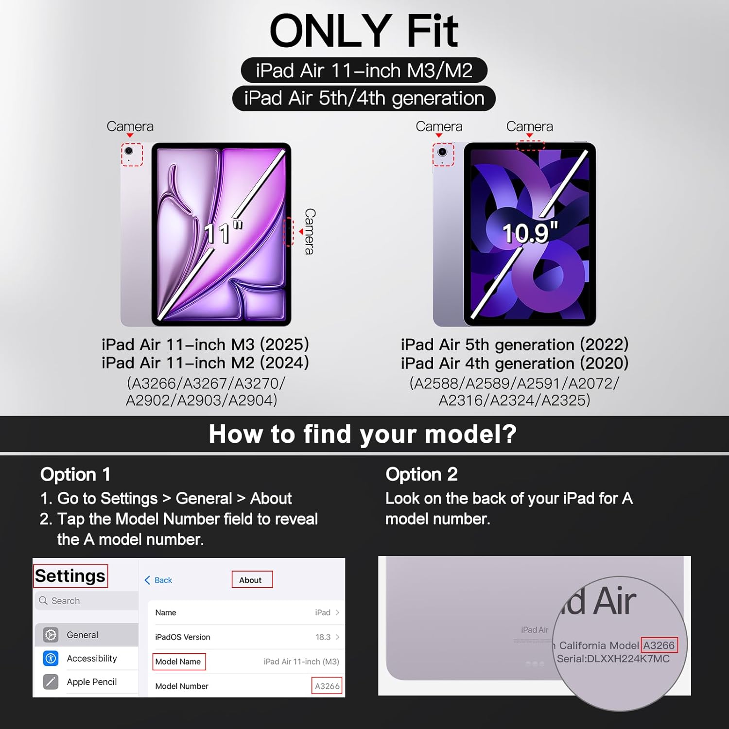 - [Compatibility] NOT for iPad (A16) 11th/10th Generation (2025/2022). Snugly fit for iPad Air 11-inch M3/M2 (2025/2024), iPad Air 5/4 (2022/2020 5th/4th generation 10.9-inch). Fit iPad Models: A3266 / A3267 / A3270 / A2902 / A2903 / A2904 / A2588 / A2589 / A2591 / A2324 / A2072 / A2316 / A2325. Please Go to Settings > General > About, then tap the Model Number field to reveal the A model number