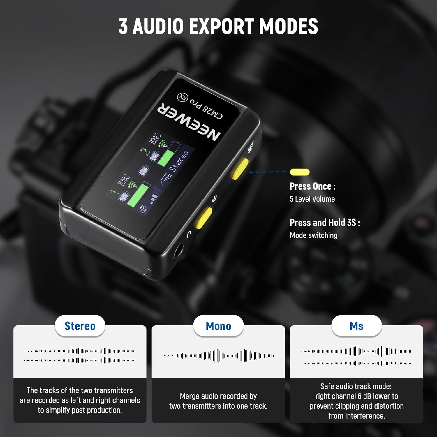 - 【4GB Storage Standalone Recording】 Each transmitter with 4GB storage doubles as a recording pen to save up to 9 hours of uncompressed 48KHz WAV audio files (up to 30min each) and supports decibel (dB) gain with a tap. Low frequency ensures accurate and warm voice recording. An LCD screen displays export modes, volume, battery levels, connection status, noise cancellation, and other info. 3 audio export modes available: Mono, Stereo, and Ms