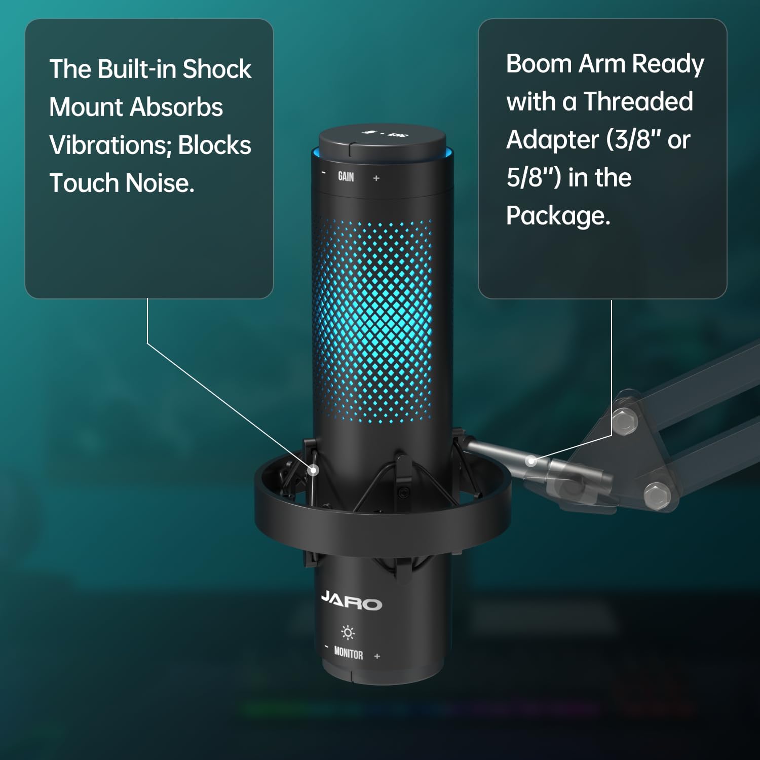 JARO USB Multi-Polar Pattern Condenser Microphone with Mute Noise Cancelation RGB for Podcasting Gaming Streaming YouTube Zoom AMSR Singing Recording [Compatible with PC Laptop Mac PS4/5], J101-CS