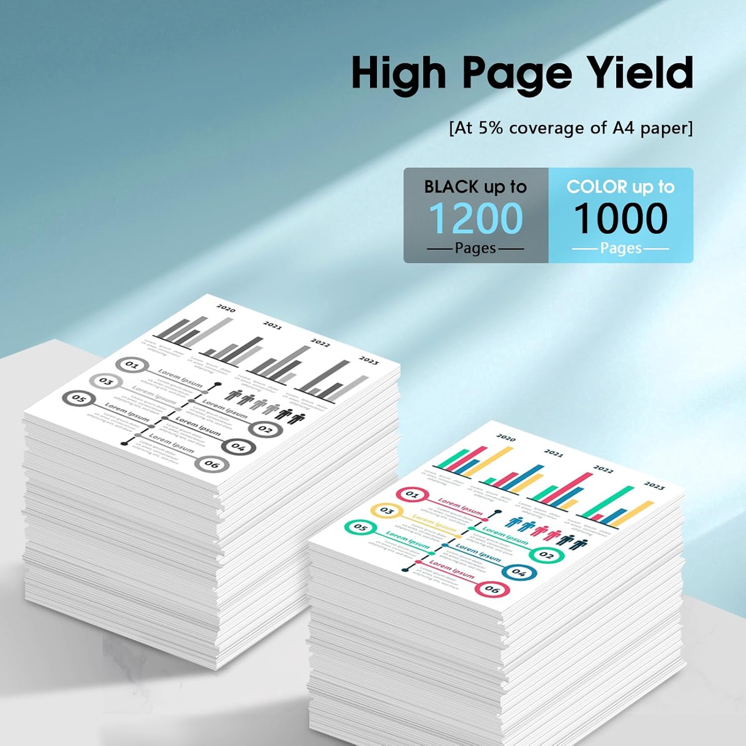 - High Page Yield: 910XL Black Ink Cartridges Is 1200 Pages, 910XL Cyan Magenta Yellow Ink Cartridges Is 1000 Page(Letter/A4, at 5% coverage)