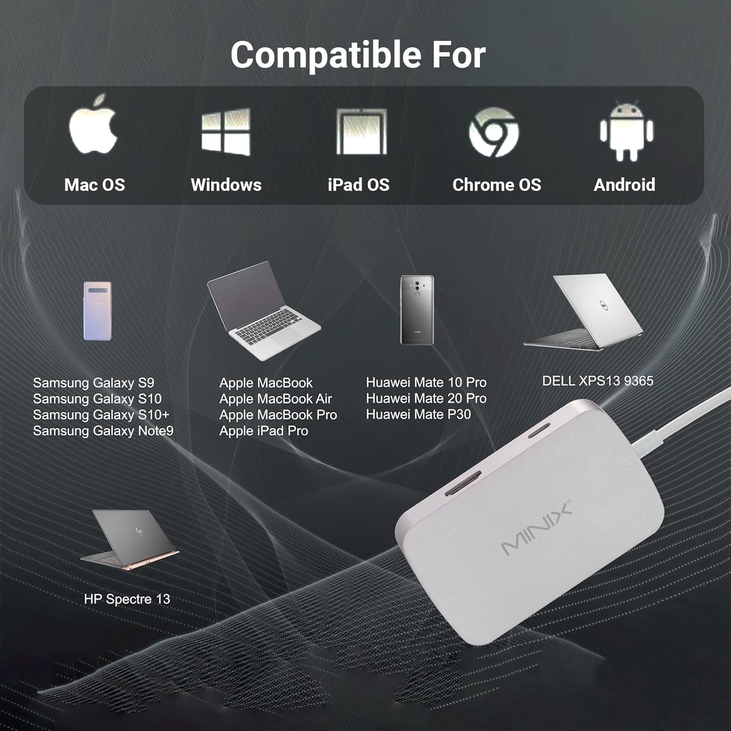 - Universal Compatibility: MINIX macbook hdmi adapter Supports MacBook Pro/Air Ipad, usb hub for laptop and More. Please note, it is important to verify your device supports display output, power input and data transfer via USB-C to ensure compatibility with the adapter
