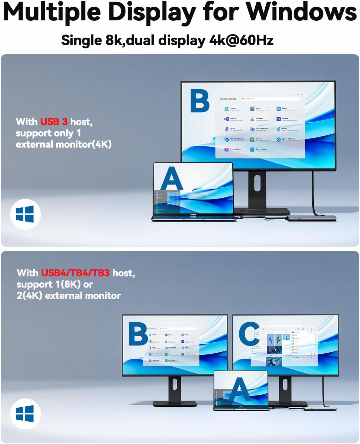- Single 8K, Dual 4K@60Hz Video Output: The usb c hub multiport adapter has SST and dual MST display modes. By using a usb 4 hub, the display can support single 8K or dual 4K@60Hz. Vivid and clear videos and images are transmitted to external displays, bringing you an immersive 3D experience. For Windows system USB4, support single 8K, dual monitor 4K/60hz. But for MacOS, both single and dual monitors are 4K@60Hz. (NOTE: For Mac M1/M2, the usbc dongle adapter only support 1 monitor)