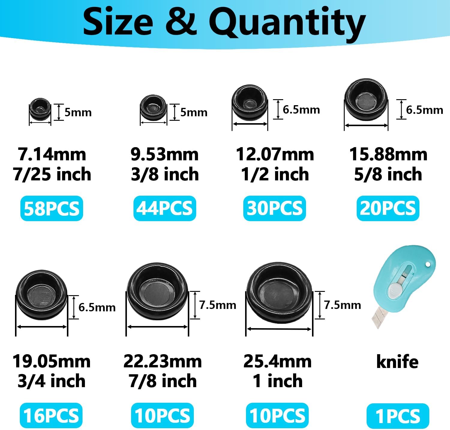 - Package Include: Our rubber grommet kit comes in 7 different sizes, 188pcs (58pcs 7/25", 44pcs 3/8", 30pcs 1/2", 20pcs 5/8", 16pcs 3/4", 10pcs 7/8", 10pcs 1") with a knife.