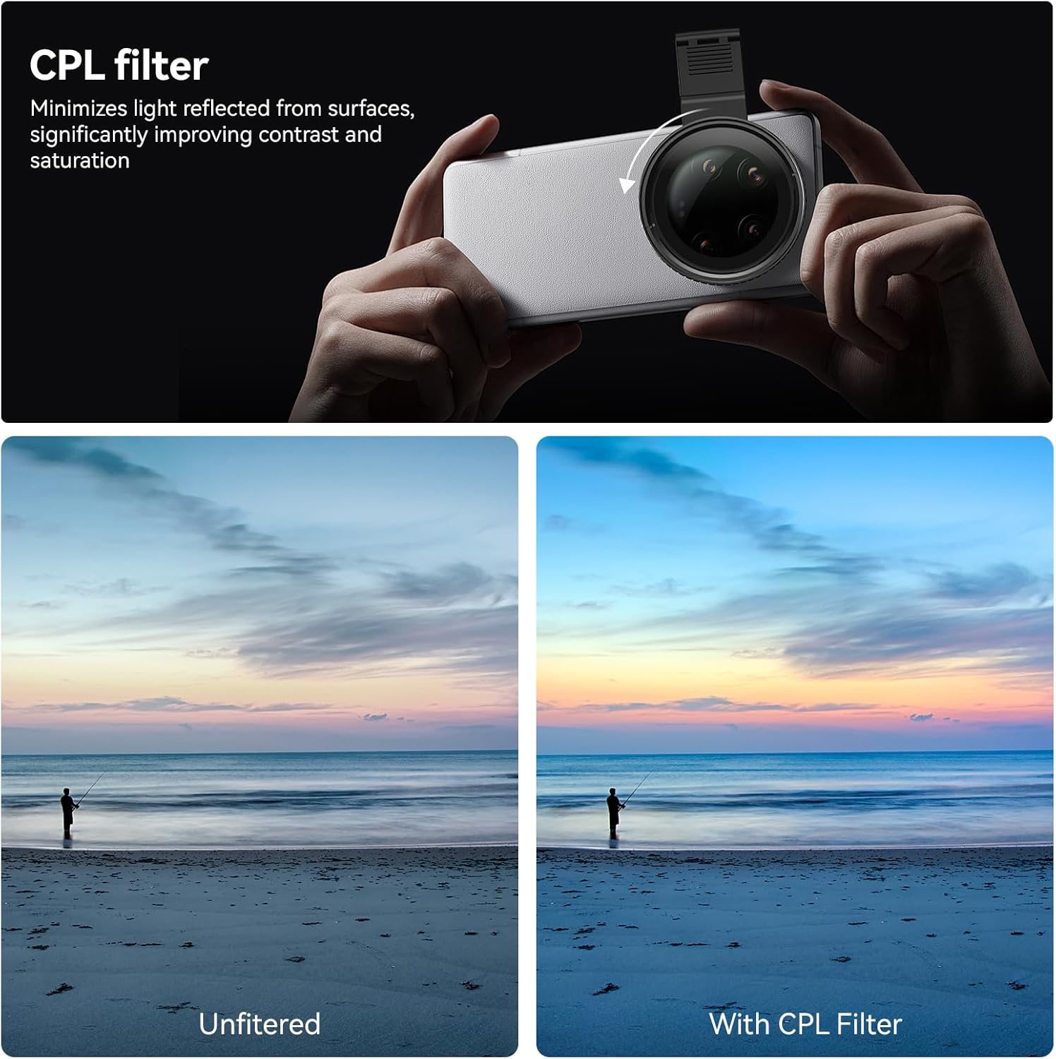 - 【Phone to Pro Camera Upgrade | DSLR-Quality Magic in Your Pocket】New photographers love our pro CPL filter that eliminates reflections from glass/water/foliage while boosting color depth. Create gallery-worthy shots instantly - no editing required. Achieve that "wow" factor with one click, making your iPhone rival pro cameras