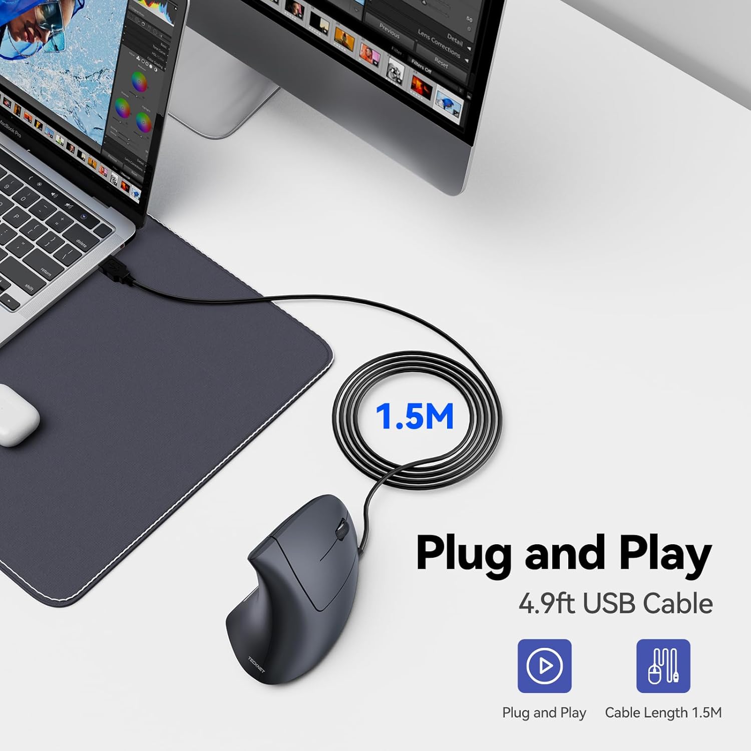 - [Plug & Play] - This ergonomic computer mouse is extremely convenient to use. Simply plug in the included 1.5m/4.9ft USB cable and start using it without any driver installation required. The ergonomic vertical mouse is smooth and durable, providing you with a long-lasting user experience.