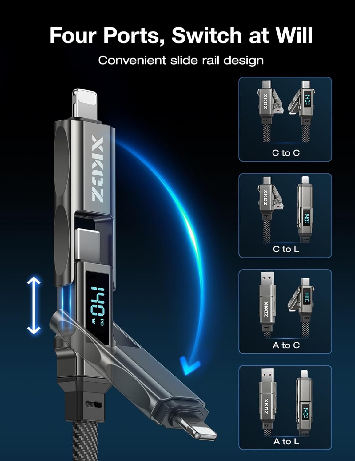 - Special Feature : 140W Fast Charging, 4 in 1 Versatile Cable, Flat Anti-tangle Nylon Braided, Real-time Power LED Display, TITAN Alloy Shell 140W Fast Charging, 4 in 1 Versatile Cable, Flat Anti-tangle Nylon Braided, Real-time Power LED Display, TITAN Alloy Shell