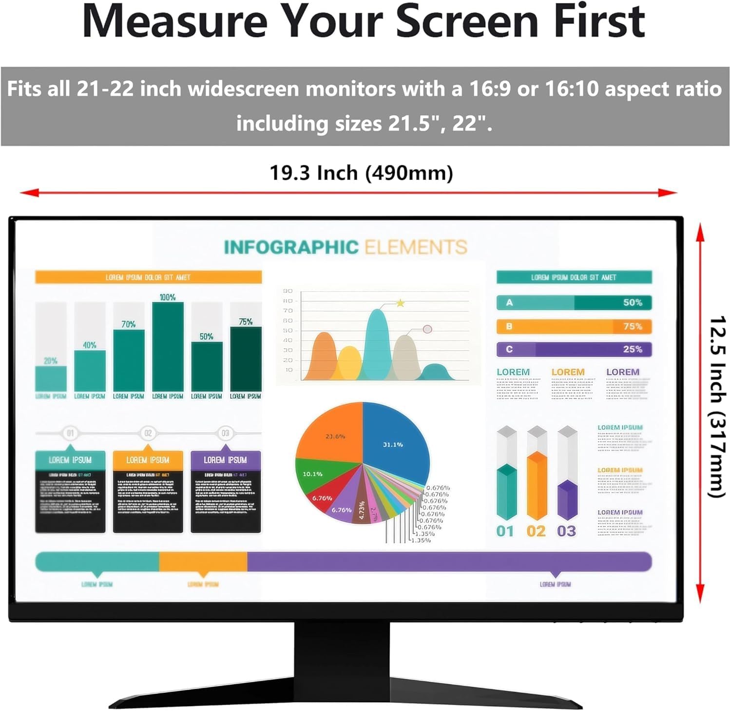 - 【 Privacy Filter Dimensions 】- Privacy Screen Fits 21 inch to 22 inch, 21"-22" widescreen monitors with a 16:9 or 16:10 aspect ratio. Actual Filter Size: Width: 19 19/64" (490mm), Height: 12 1/2" inches (317mm). Compatible with HP Dell Acer Samsung LG ViewSonic and More. The length and width may not be a perfect fit, so the filter may be a little longer and wider.
