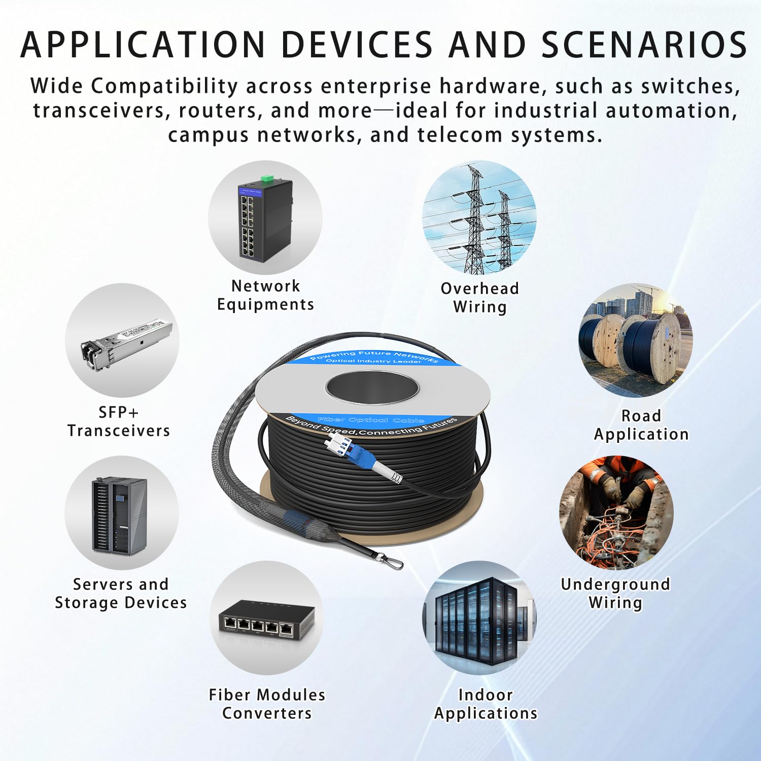 - 【Rugged Armored Outdoor Design】This 164ft (50M) single mode fiber optic cable features built-in stainless steel armor to resist crushing, moisture, rodent bites, and UV exposure. Perfect for harsh outdoor environments such as underground conduits, exterior building links, or industrial wiring.