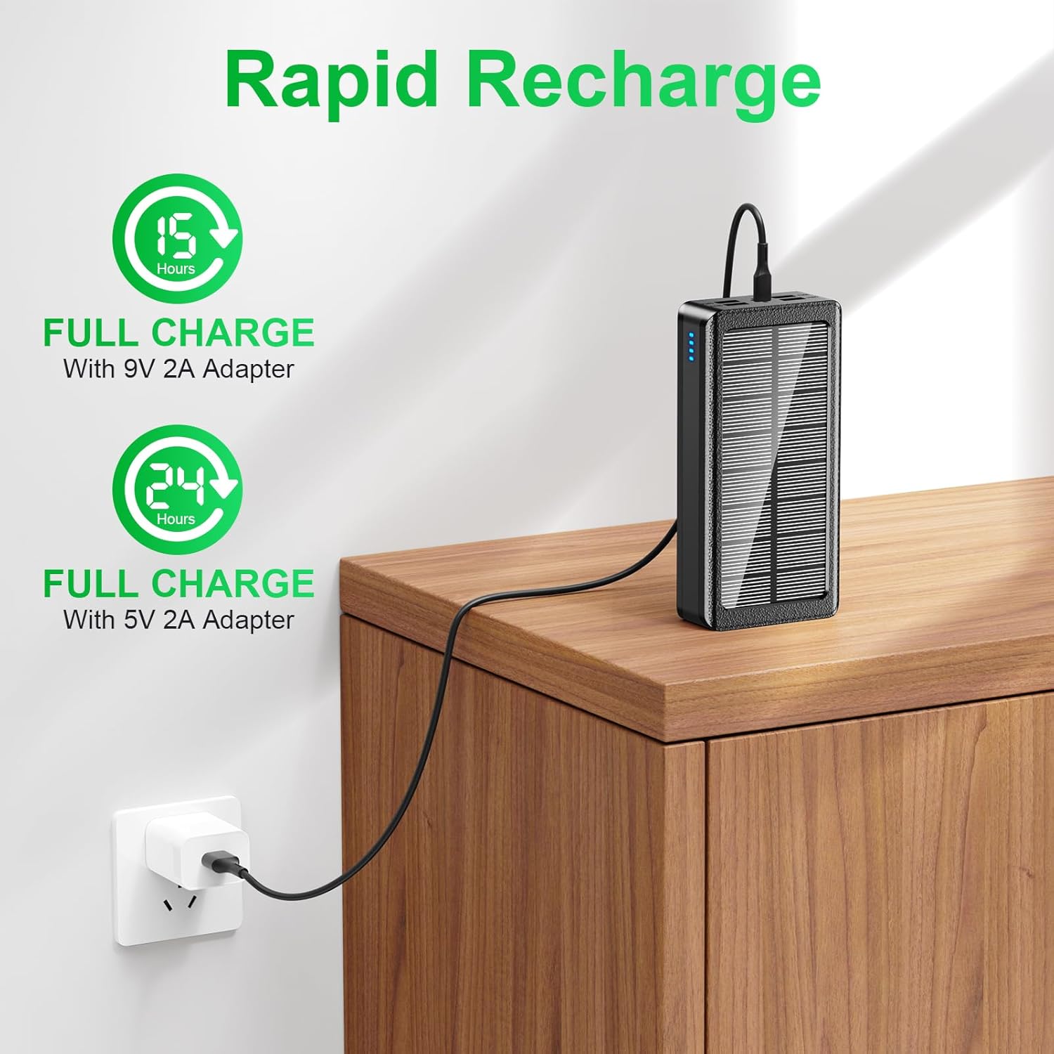 - Reminder :When The Solar Battery Bank Is Being Cared For, It Will Generate Current To Charge The Battery, And The Indicator Light Will Flash.Solar Charging Is Affected By The Instability Of Sunshine Intensity And Duration. The Solar Power Capacity Of The Product Is Very Large, So The Charging Will Be Very Slow And Should Be Used As An Emergency Function. For Daily Charging, Please Use A Charger With A Power Above 5V2A To Charge The Device.