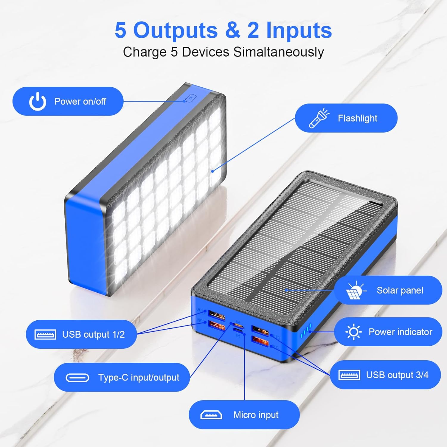Solar Charger Power Bank 66800mAh Portable Charger with USB-C in/Output 22.5W QC3.0 Fast Charging 5 Out Ports Battery Pack Built-in 32 Led Flashlights for iPhone Samsung Tablet Camping