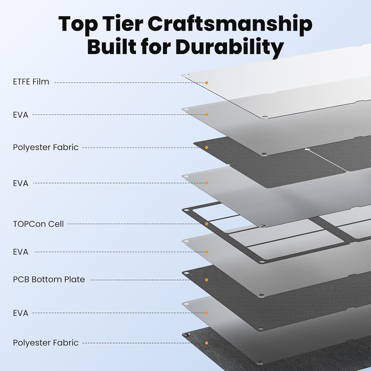 - 【Long-lasting and IP68 Waterproof】200W folding solar panel utilizes ETFE coating material, ensuring waterproof, dustproof, and long-lasting durability, capable of withstanding any harsh weathe.