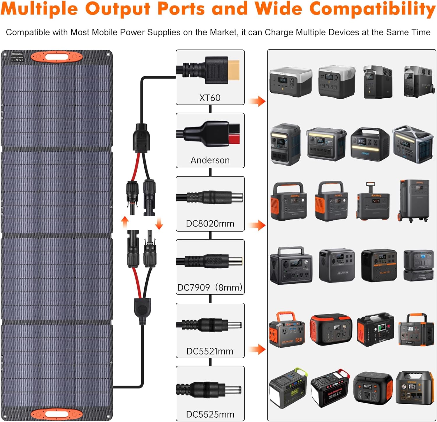 - 【Compatible with Most Solar Generators】SOKIOVOLA 200W Portable Solar Panel comes with MC-4 to 5-in-1 solar panel connectors (XT60, DC5521,DC7909 (8mm),DC8020, Anderson),compatible with most solar generators/portable power stations on the market. Compatible with most solar,generators/portable power stations on the market (e.g. Jackery,Ecoflow,Blutti,FlashFish,Goal Zero,Anker,etc.)