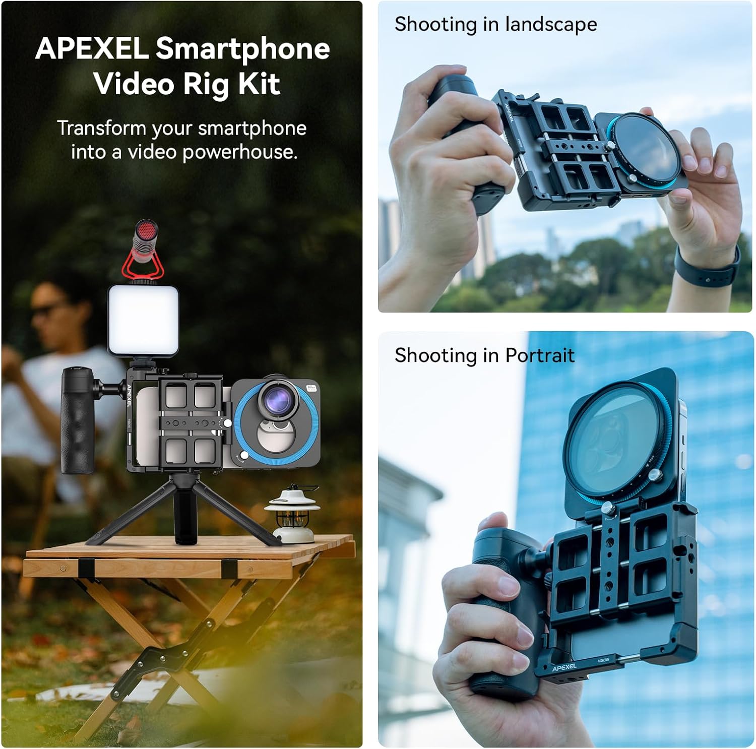 - đ˝ď¸ăProfessional Video RigăAPEXEL phone rig video kit turns your smartphone into a powerful video and photography tool. Smartphone Video Rig with a simple setup and compact design, itâs perfect for social media creators, influencers, video makers, filmmakers, vloggers, etc. ďźYou can view the installation guide video on the pageďź