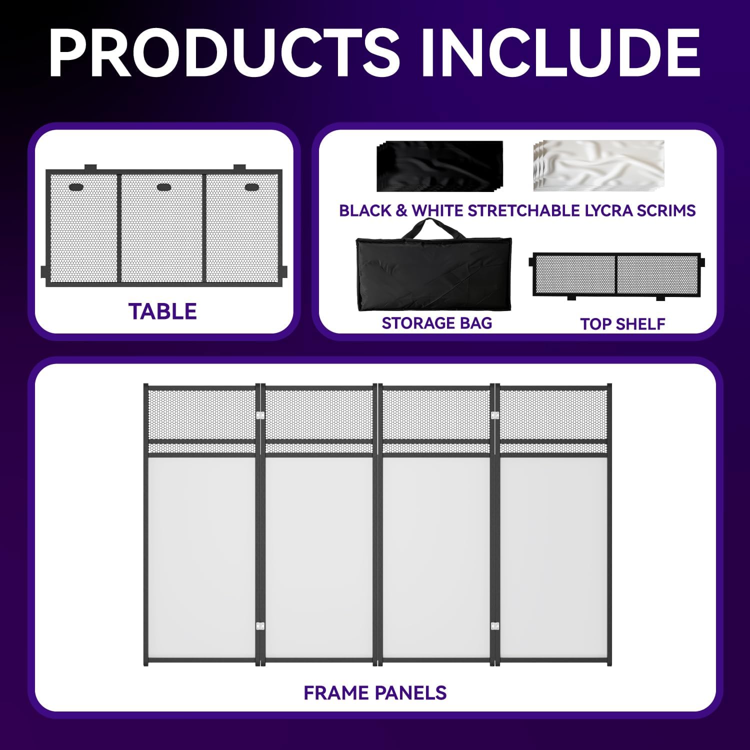 - 【Two-color Gauze】The DJ facade booth has 4 black gauze and 4 white gauze. The Velcro design helps you quickly change the gauze as needed. The gauze can hide your wires and extra equipment under the table, making your DJ workspace neater and more professional, giving the audience a good view. You can project lights on the gauze to create a colorful light show to create a different atmosphere and enhance your music and party