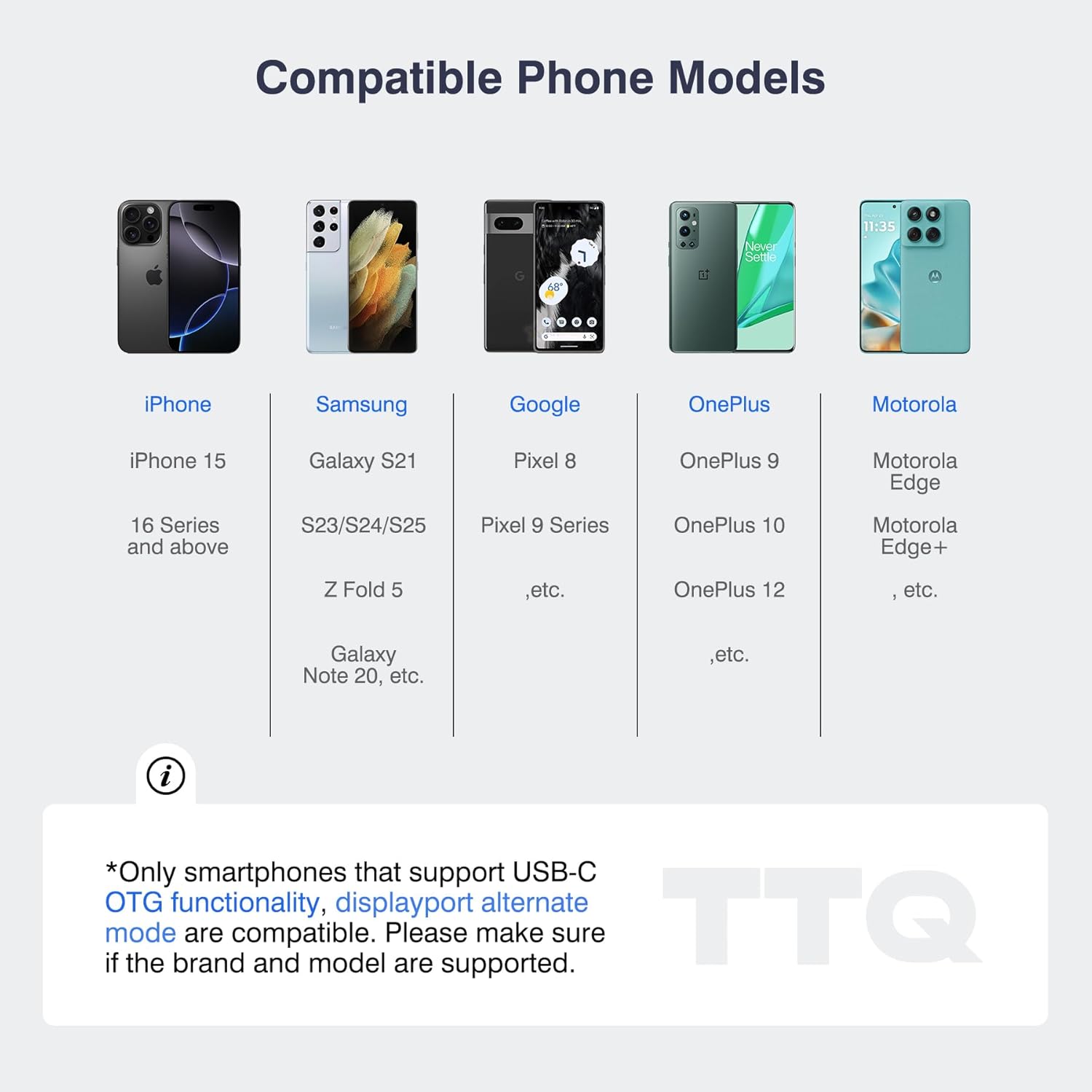 - Uninterrupted Audio & Compatibility: Back camera selfie monitor preserves all phone audio functions during recording: take calls, play music, or receive notifications without cutting the video feed. COMPATIBLE MODELS: iPhone 15, 16 series and above; Samsung Galaxy S21, 23, 24, 25 series, Z Fold 5, Note 20, etc; Google Pixel 8, 9 series; OnePlus 9, 10, 12 series; Motorola Edge, Edge+ series. For more supported models, please contact our technical support.