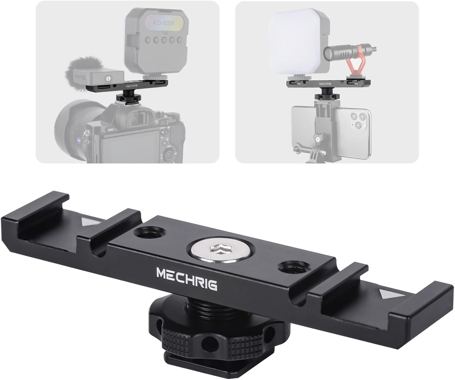 - Dual Cold Shoe Mount Extension - Expand Your Gear, Double Your Creativity: Attach two devices at once—LED lights, mics, action cams, or monitors—on this 4-inch aluminum extension bar. Perfect for vloggers needing simultaneous lighting and audio, or photographers rigging multiple angles without swapping mounts