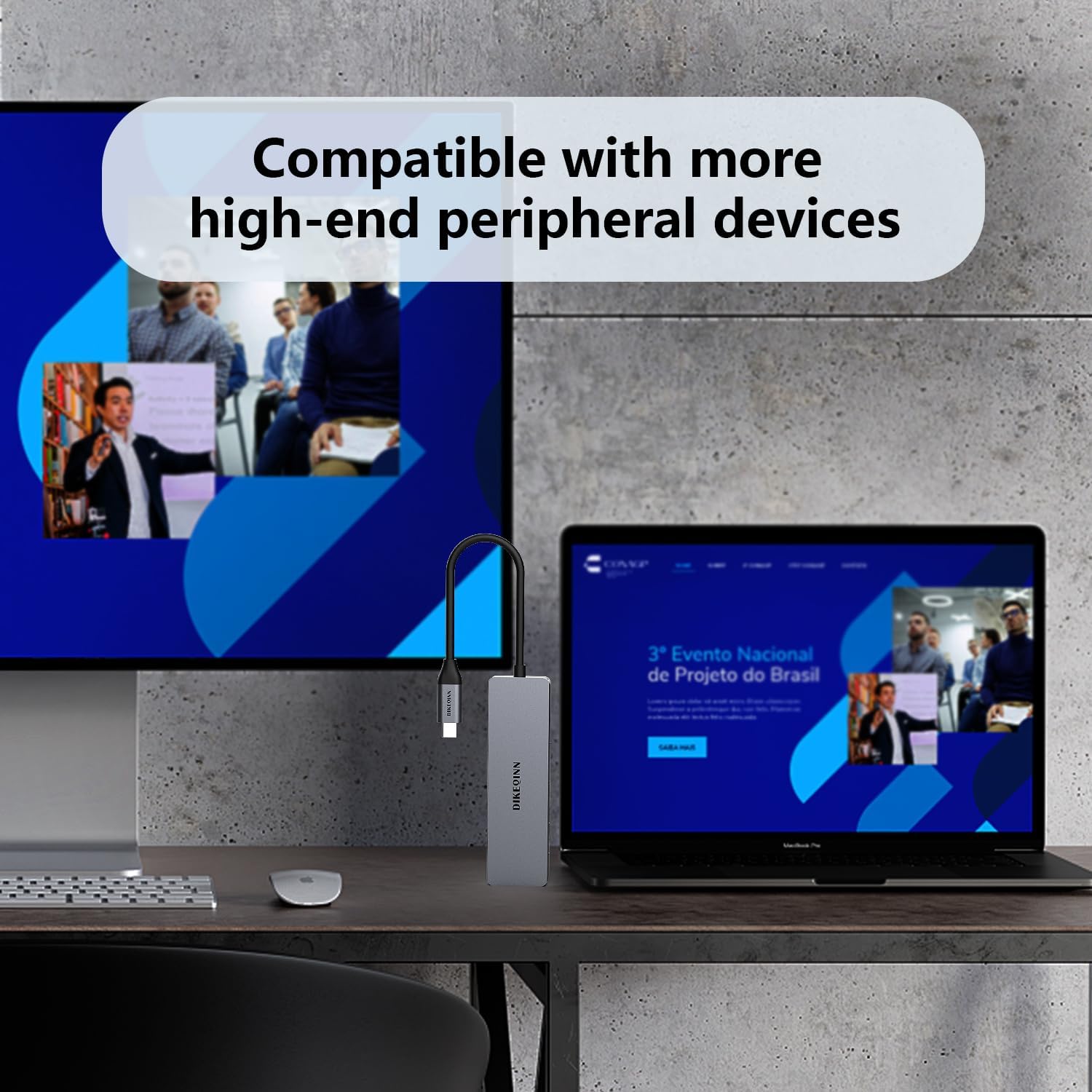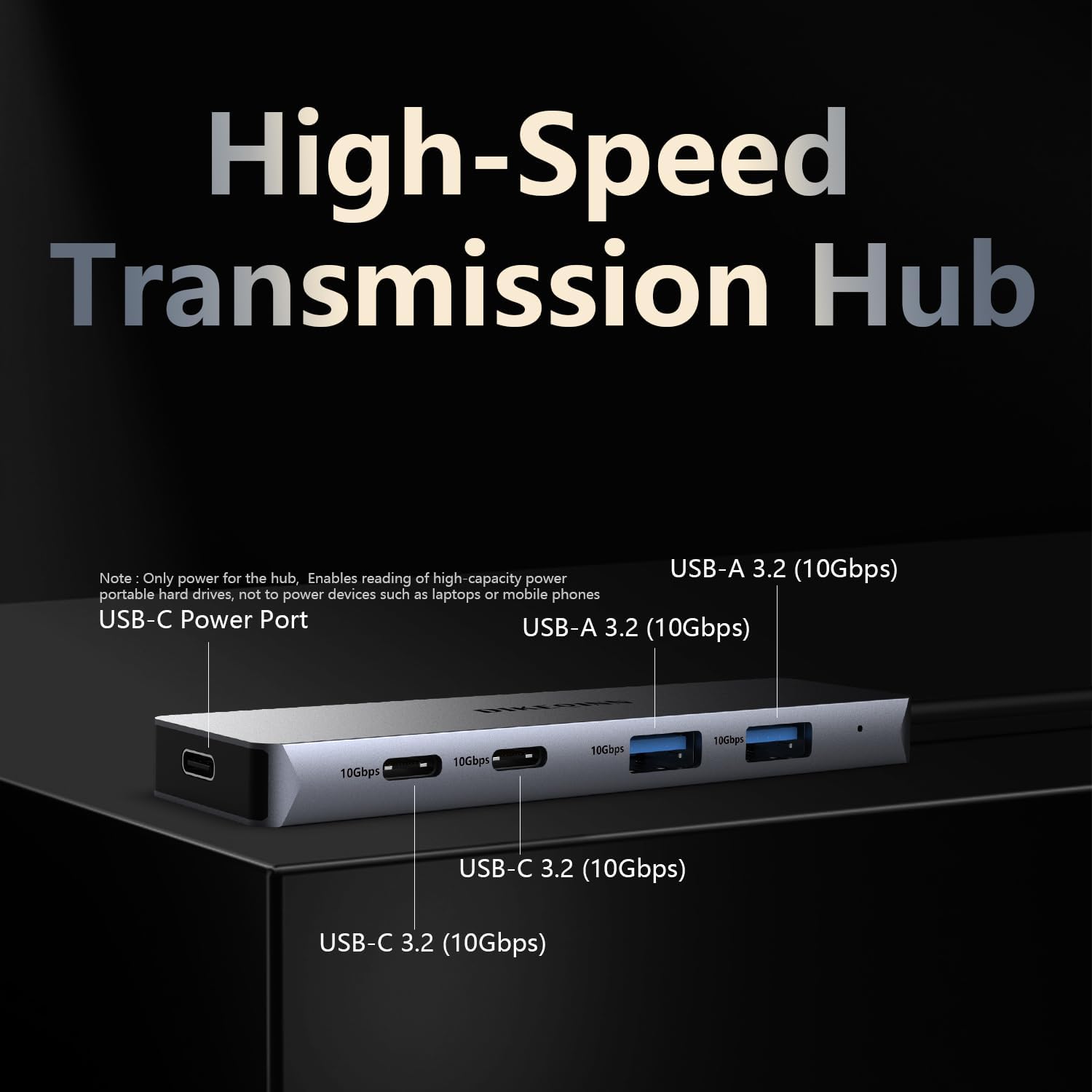 - 🔌 Smart Port Expansion for Workflows Convert 1 USB-C port into 4 high-speed connections: ▸ 2× USB-C 3.2 (10Gbps data) ▸ 2× USB-A 3.2 (10Gbps data) ▸ Simultaneous access to external drives, flash disks, and peripherals