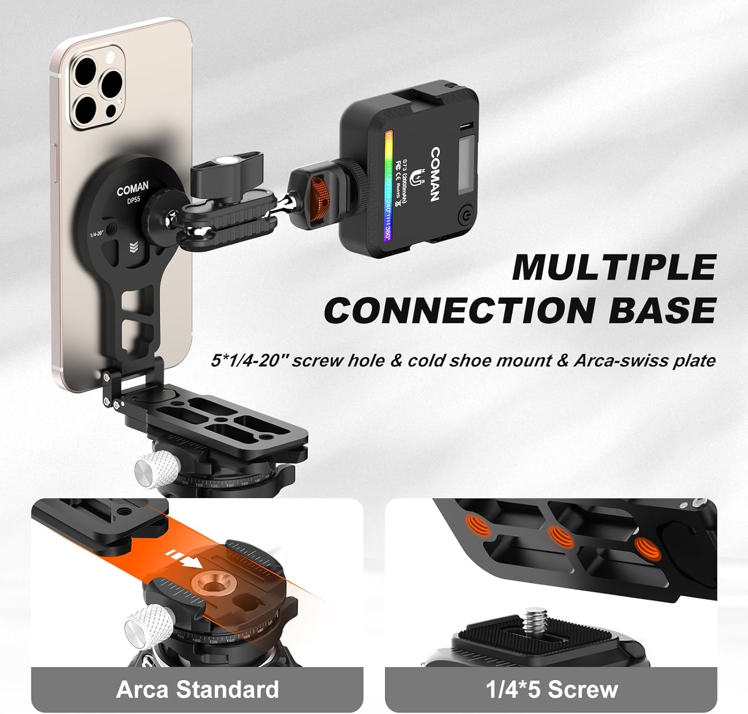 - 【1/4"-20 Screw & Cold Shoe Mount & Arca-Swiss 】 The magnetic phone holder comes with five 1/4”-20 screw phone tripod mount, cold shoe mount and arca-swiss base, for compatibility with more devices and convenience, making installation quick and easy. perfect for vlogging, video recording, live streaming, filming, etc
