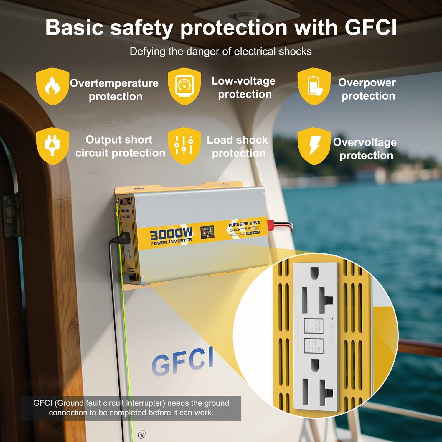 - 【6 PROTECTIONS & GFCI OUTLET】We have configured a full range of powerful protections for this inverter: under-voltage protection, over-voltage protection, overload protection, over-temperature protection, short-circuit protection and reverse polarity protection. The GFCI (Ground Fault Circuit Interrupter) outlet allows you to use various electrical appliances more safely. NOTES: The power source should be a deep-cycle battery with a discharge level of 80% or more.