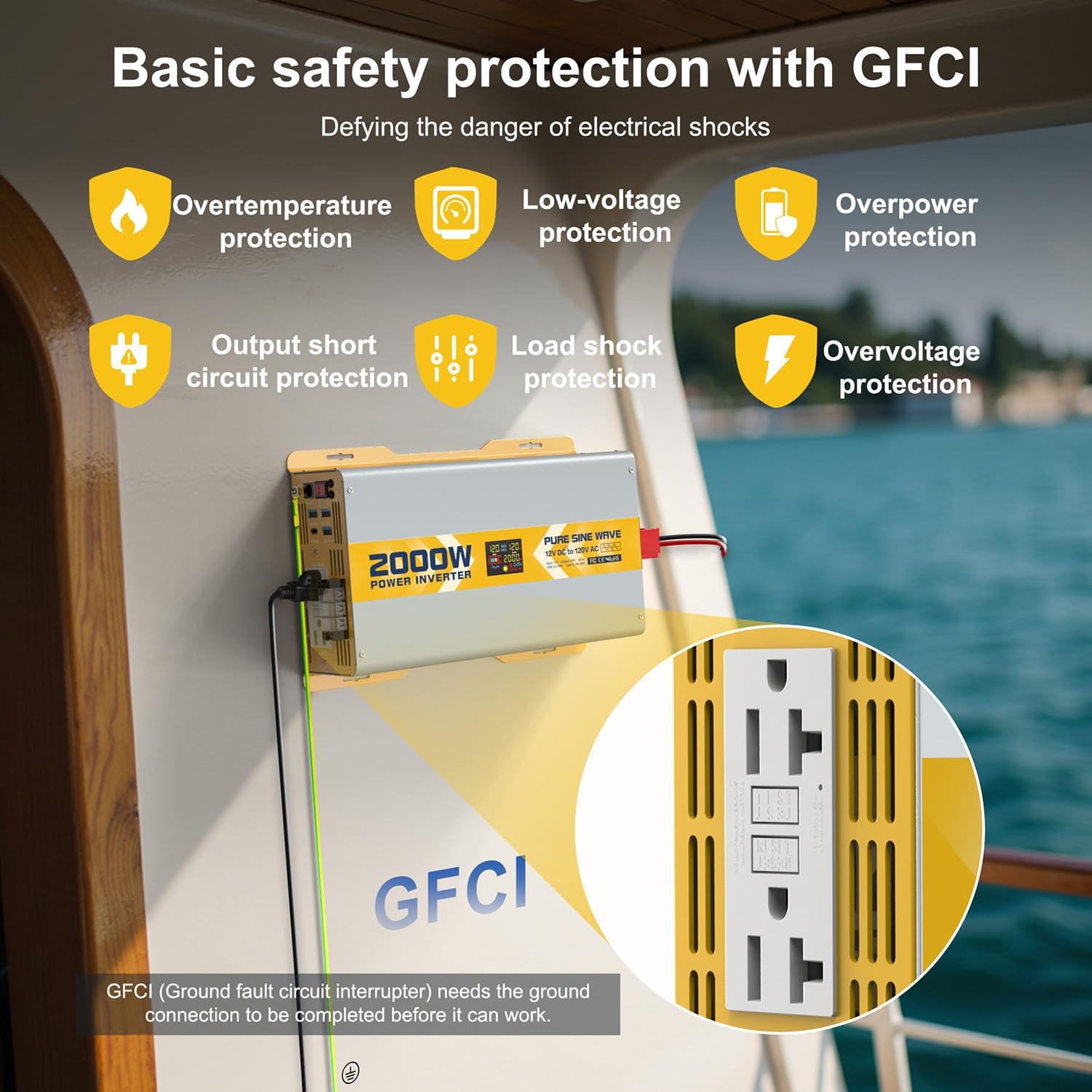 - 【6 PROTECTIONS & GFCI OUTLET】We have configured a full range of powerful protections for this inverter: under-voltage protection, over-voltage protection, overload protection, over-temperature protection, short-circuit protection and reverse polarity protection. The GFCI (Ground Fault Circuit Interrupter) outlet allows you to use various electrical appliances more safely. NOTES: The power source should be a deep-cycle battery with a discharge level of 80% or more.