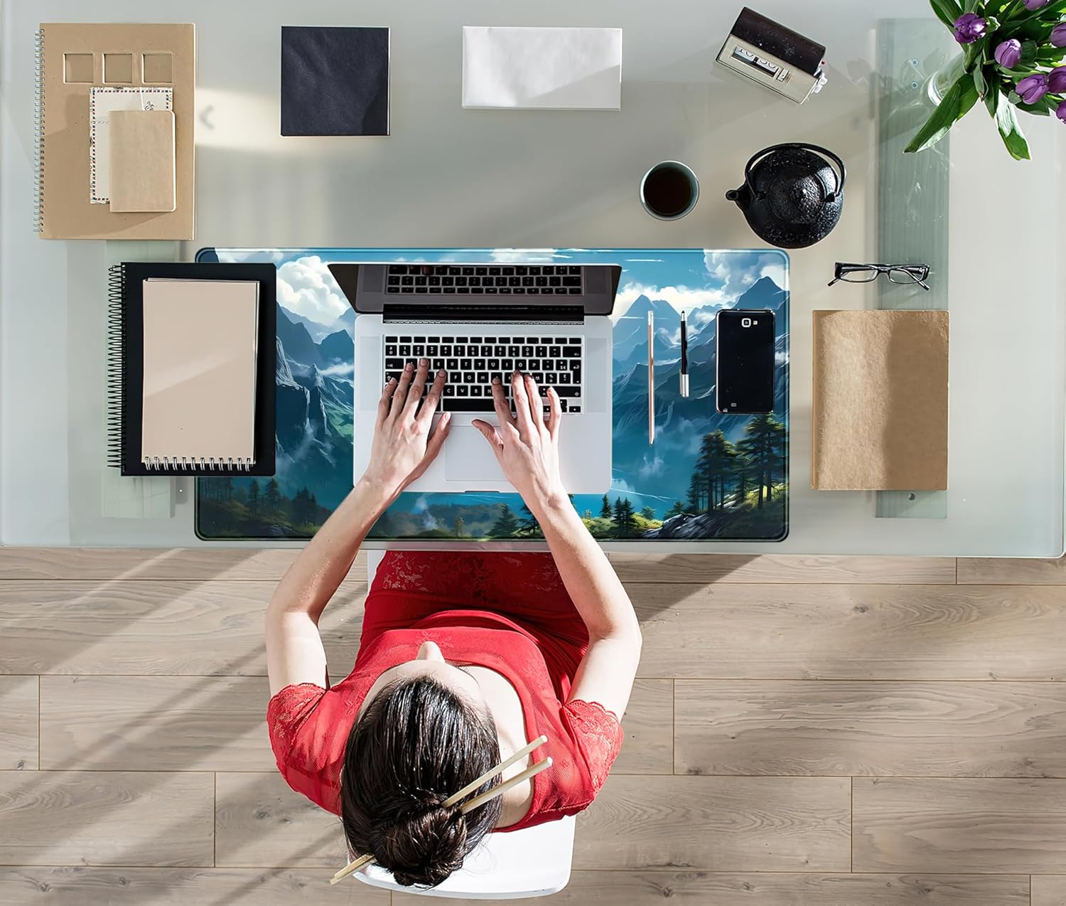 Aesthetic Mountain Vista Desk Mat, Blue Natural Wonder XXL Large Extended Gaming Mouse Pad Mat Non-Slip Mousepad, Computer Keyboard and Mouse Mat, Desk Pad with Stitched Edges, 31.5x15.75 in