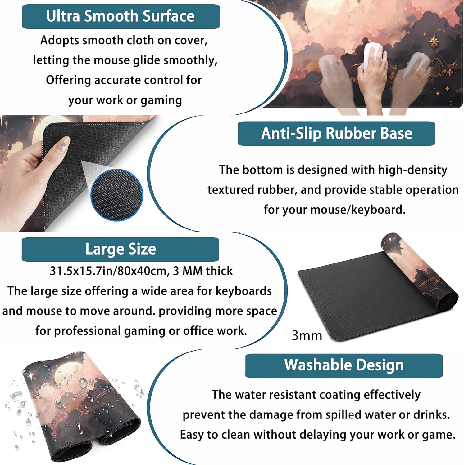 Pink Black Clouds Desk Mat XXL Large Extended Gaming Mouse Pad Celestial Mousepad with Stitched Edges, Office Desktop Decor Desk Pad Computer Mat, Laptop Keyboard and Mouse Mat, 31.5x15.75 in