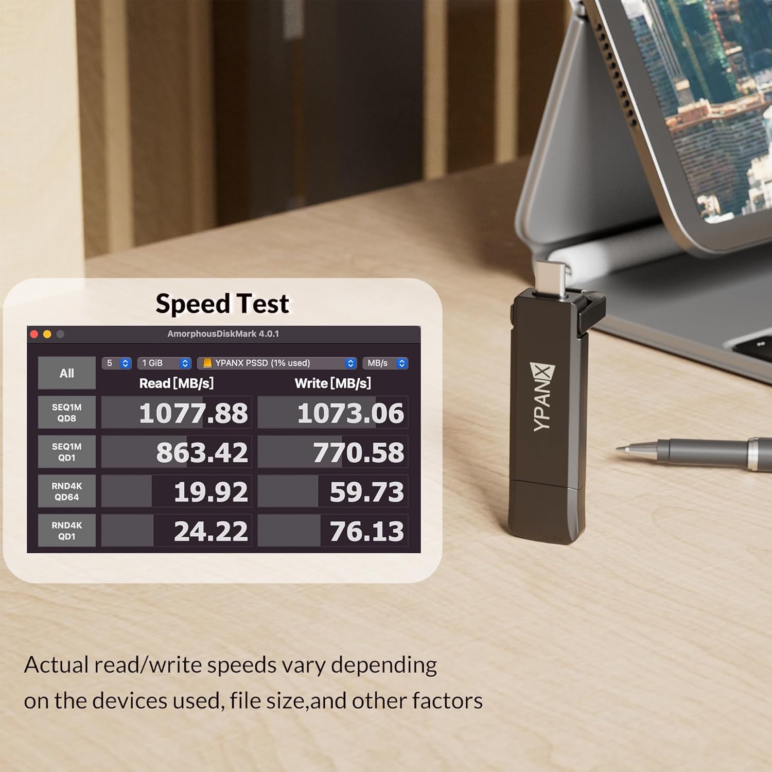 - 【Blazing Fast Speed – Up to 1000MB/s】Enjoy ultra-fast data transfer speeds of up to 1000MB/s with the YPANX portable SSD, equipped with USB 3.2 Gen2 and Type-C dual ports. Save time transferring large files, videos, photos, or games. The enhanced casing design significantly improves heat dissipation, ensuring consistent peak performance even during heavy file transfers.