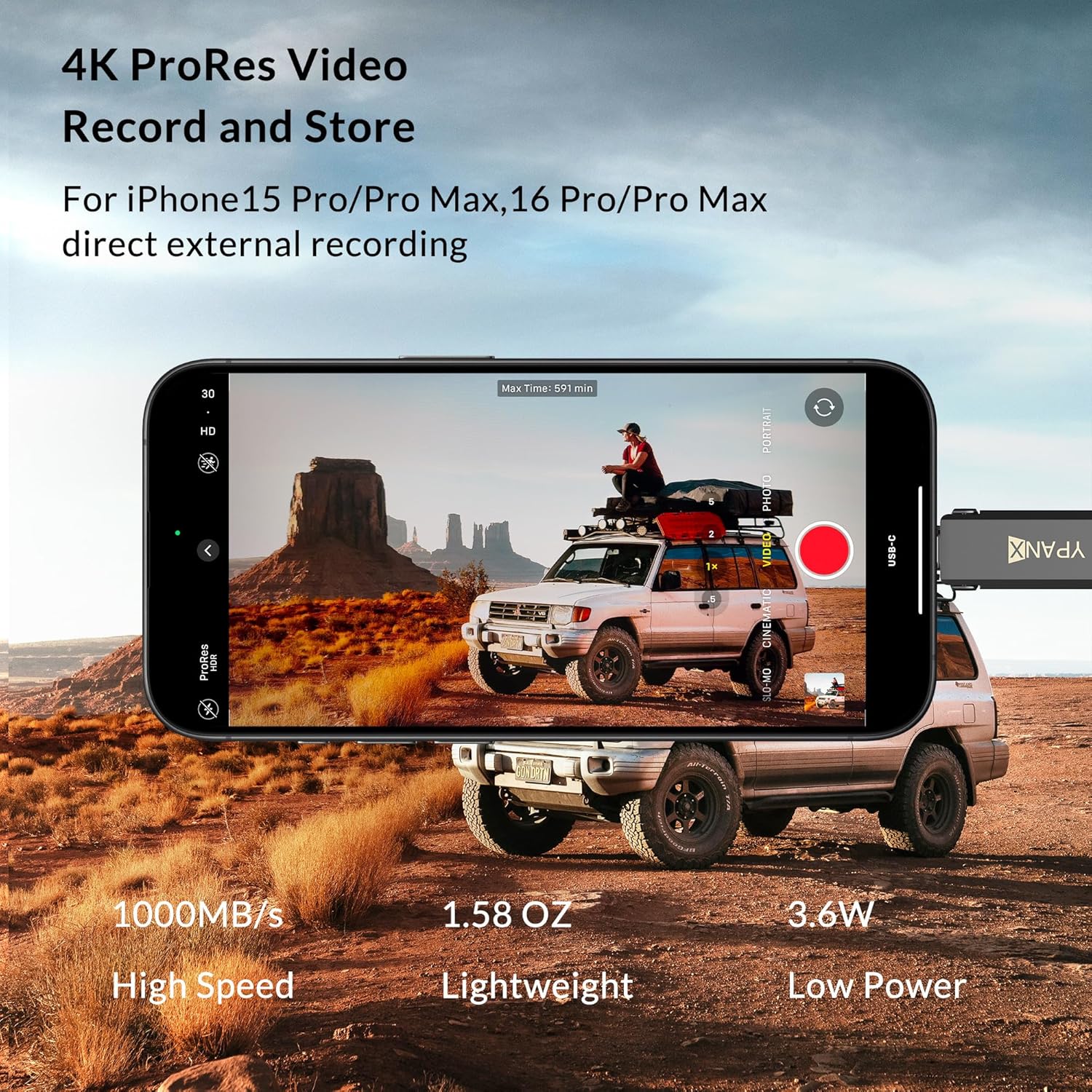 - 【4K ProRes HDR Support】Record and save 4K ProRes HDR videos directly from your iPhone 15 Pro/16 Pro or Pro Max to the SSD without the hassle of secondary transfers. Seamlessly enhance your video recording and editing workflow with this external storage solution.