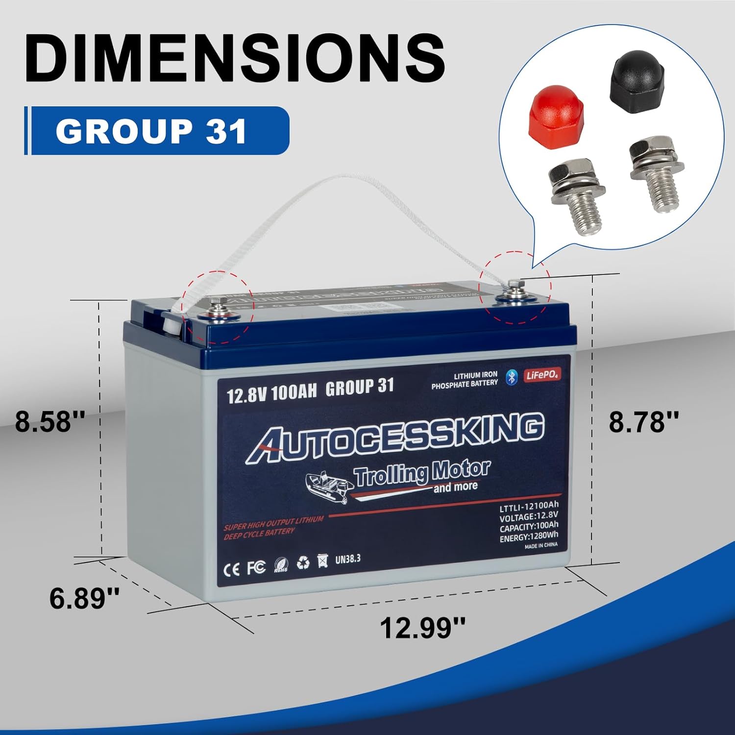 - ✅ LIGHTWEIGHT AND VERSATILE - Item Dimensions: 13"L x 6.77"W x 8.66"H. Our 12v battery engineered with Lithium Iron Phosphate (LiFePO4) technology, offering 1/3 the weight, 2x power and 8x longer lifespan compare to a lead acid battery. It is a perfect upgrade for any 12V Deep Cycle battery. It offers 1.28kWh of energy and supports a maximum load of 1536W with a continuous discharge current of up to 120A (peak 500A for 3 seconds), making it ideal for trolling motors. The built-in Bluetooth functionality brings you enhanced convenience, you can monitor the battery anytime, anywhere.