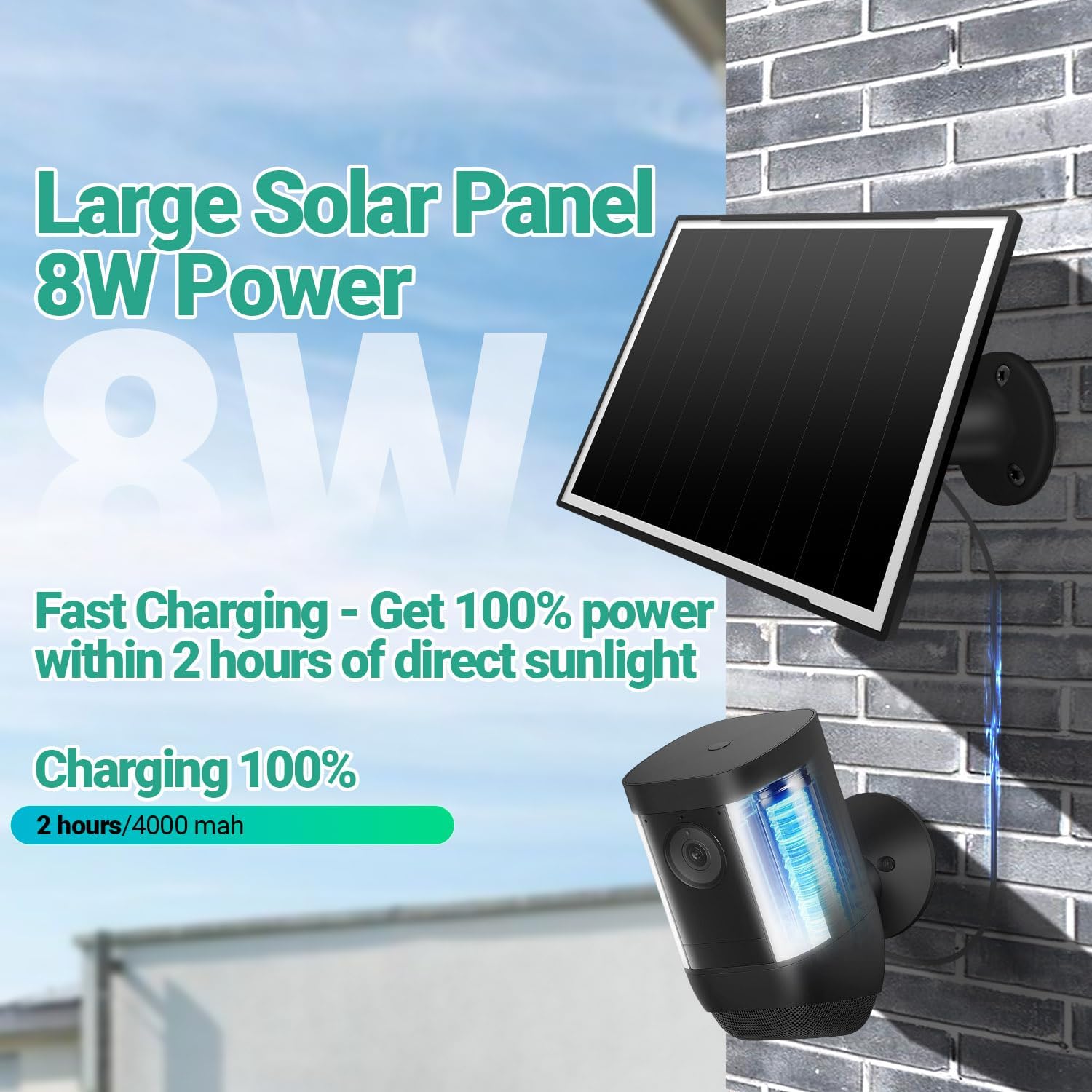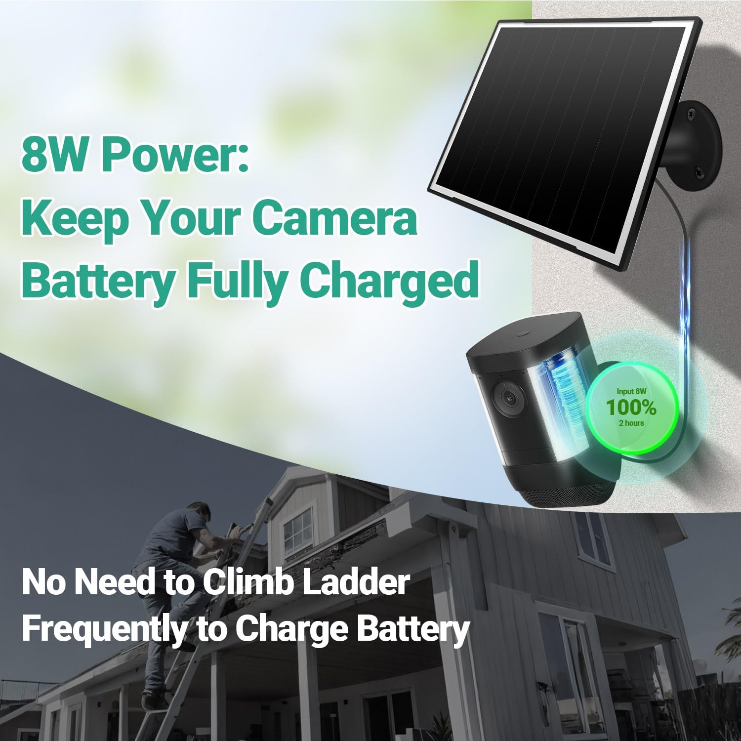 - 【Fast & Efficient】This product features a larger solar panel(8W) than most competitors and higher - efficiency HPBC monocrystalline silicon cells. In full direct sunlight, it fully charges Ring cameras in 2 hours. Even on cloudy days, it supplies the camera's power needs.