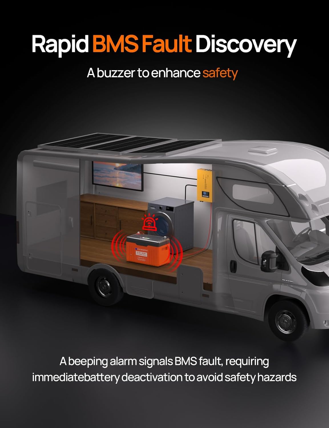 - Why Choose It:ECO-WORTHY Newly Upgraded LiFePO4 battery has passed over 15 strict tests. Has smart abnormal detection and a built-in buzzer that alerts you to BMS faults instantly for electrical safety