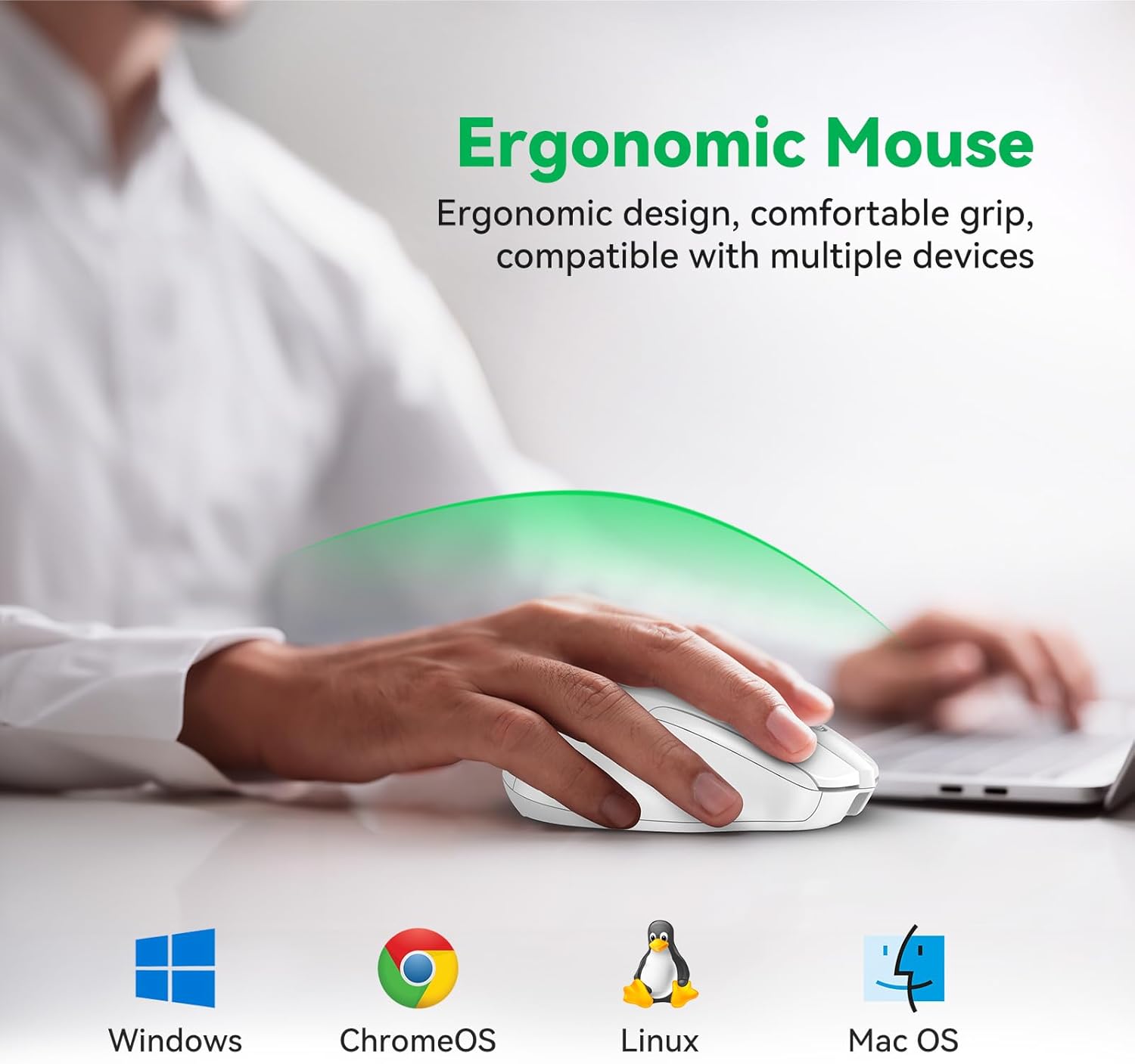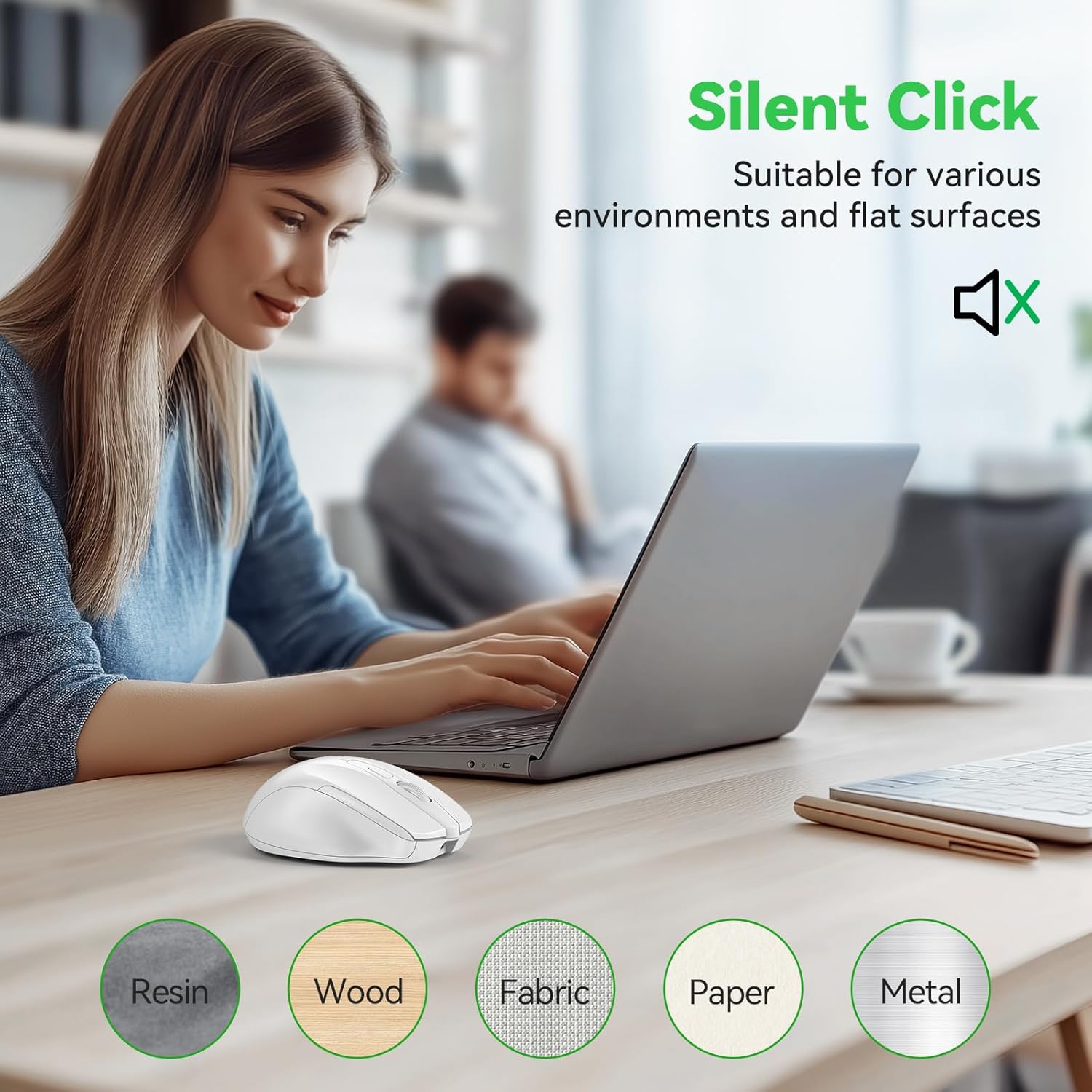 Bluetooth Mouse (BT5.0/3.0 & 2.4G) Rechargeable Wireless Mouse 2.4GHz with USB A Receiver, 4800 DPI Optical Tracking, 6 Adjustable DPI, Quiet Clicks, 6 Buttons, Wide Compatibility - White