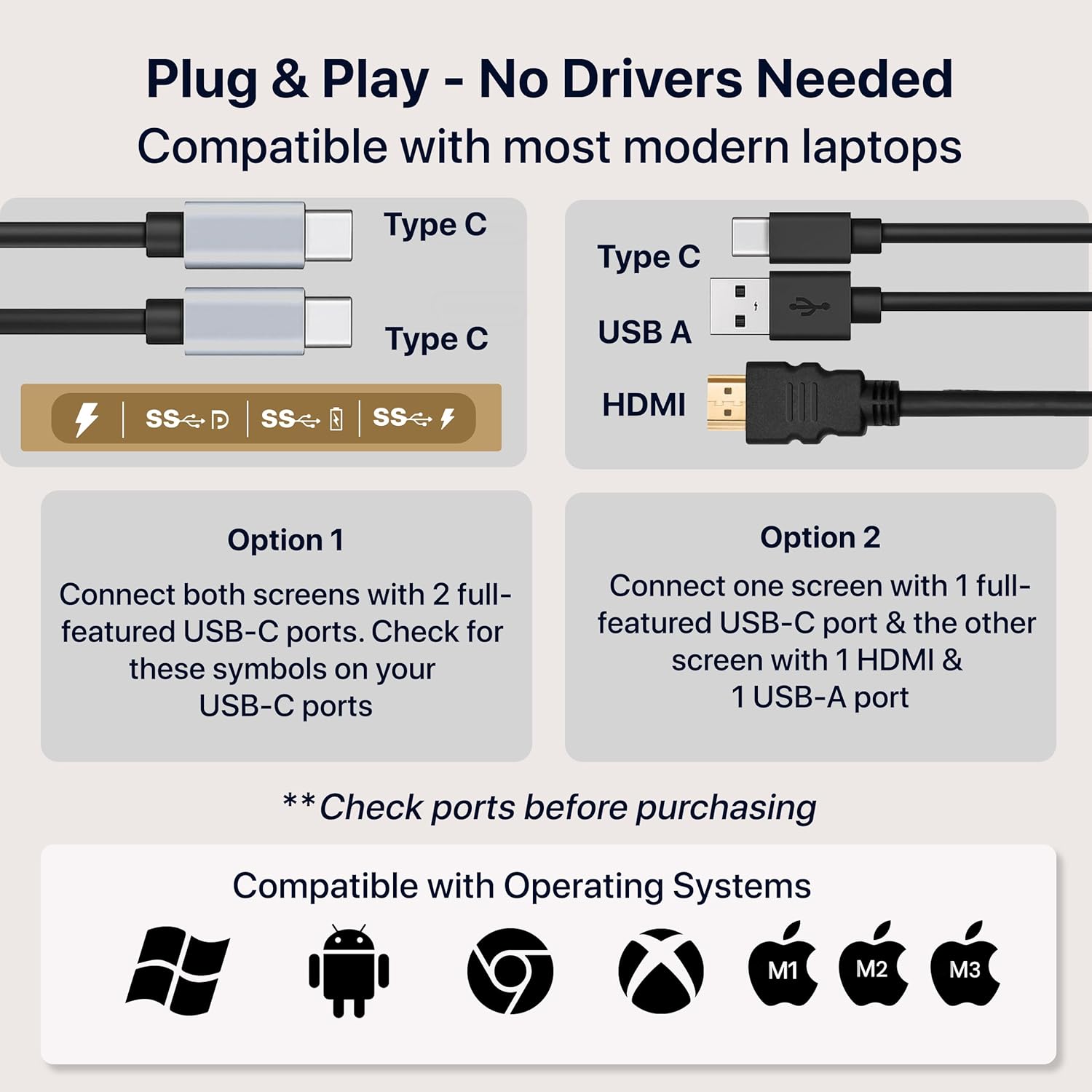 - CHECK COMPATIBILITY BEFORE BUYING - To use the monitors without an external power source you need to check our images for which ports you need. If you use an older model laptop you might have to use an external power supply for the screens. Our included instructions and starter video guide will walk you through everything!