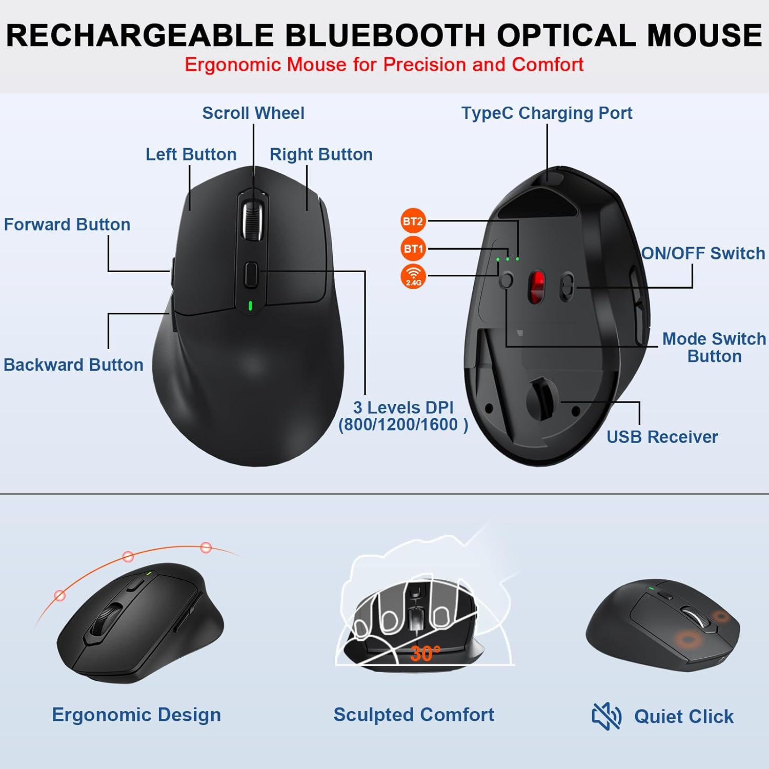 - ▶[Ergonomic Sculpted Shape Mouse] : The wireless ergonomic mouse is designed with palm and thumb rests that provide better wrist support and keep your hand in a natural position, effectively reducing the wrist strain and pain. 2000 DPI enables you to obtain more precise control. The added forward/backward buttons offer more convenience when browsing webpages.