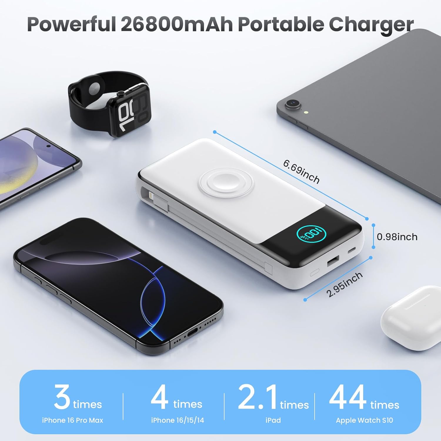 - 【Wide Compatibility】This 26800mAh portable charger with built in 2 cables(Type-C,ios) and magnetic wireless charger for iWatch, Widely compatible with iPhone16/15/14/ 13/12/11/XS/XR/SE Pro/Pro Max, Samsung S24 /S23 Series,Google Pixel, LG,Moto,tablets,Android devices,Apple Watch Ultra 2/Ultra/10/9/8/7/6/SE /5/4 /3/2 ,AirPods and more.