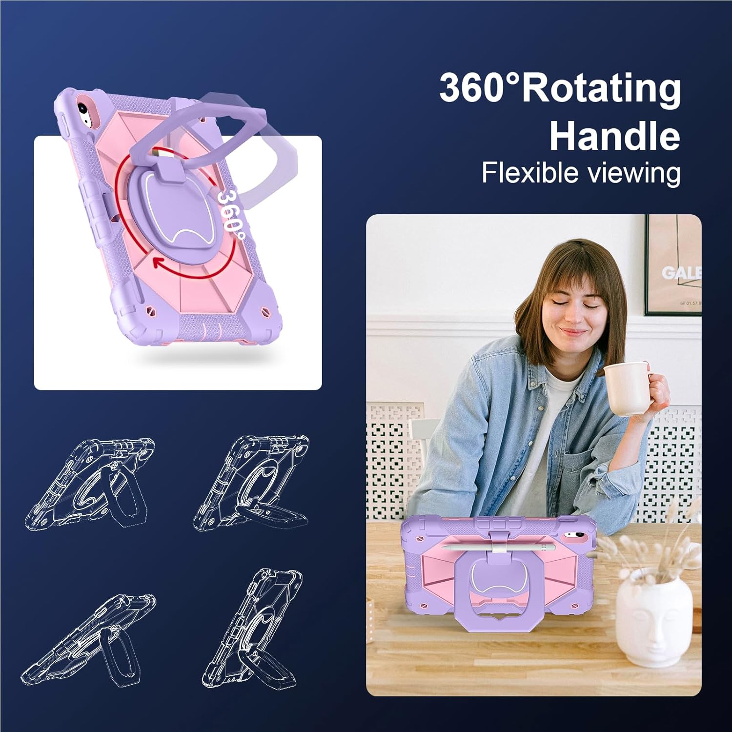Case for iPad (A16) 11th Generation 11 Inch (2025), iPad 10th Generation Case 10.9 Inch (2022), Shockproof Cover with 360° Rotating Stand Screen Protector Pen Holder Shoulder Strap, Purple Pink