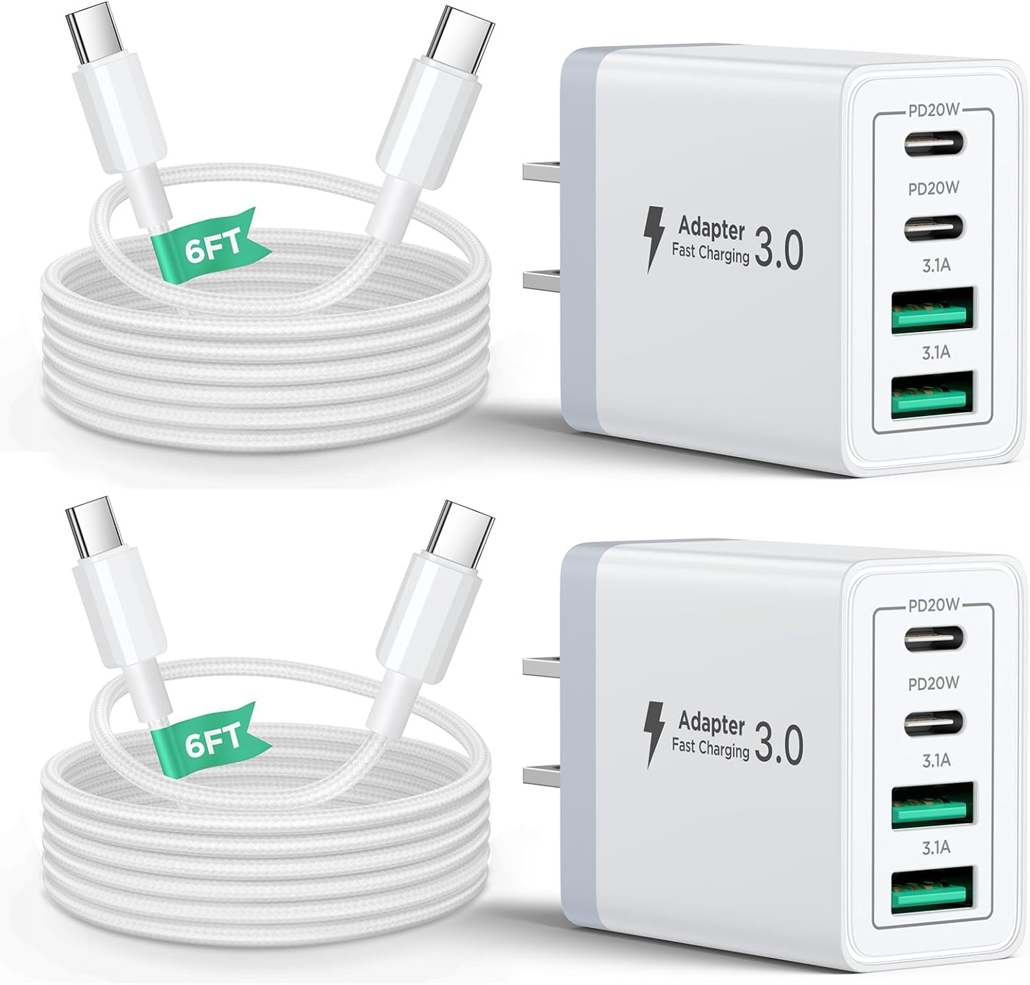 40W USB C Charger Block, 2Pack 4-Ports Type C Fast Phone Charging Cube with 6FT USBC to USBC Cord, Multiport Wall Plug Power Brick Box Compatible with iPhone, Samsung, iPad Pro, Cellphones Charger
